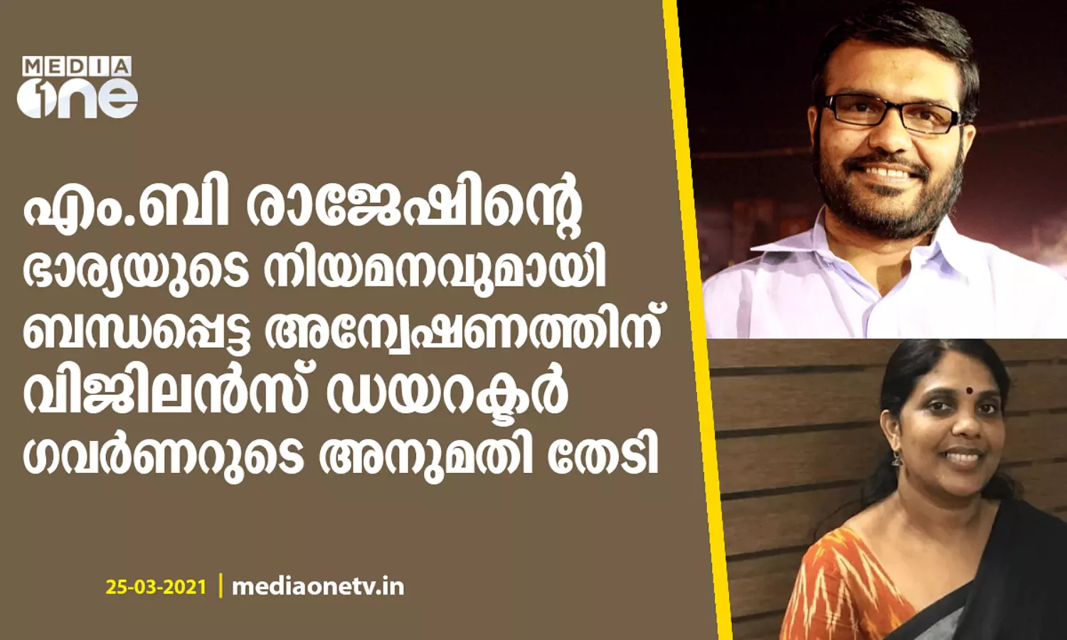 എം.ബി രാജേഷിന്റെ ഭാര്യയുടെ നിയമനവുമായി ബന്ധപ്പെട്ട അന്വേഷണം; ഗവർണറുടെ അനുമതി തേടി വിജിലൻസ് ഡയറക്ടർ