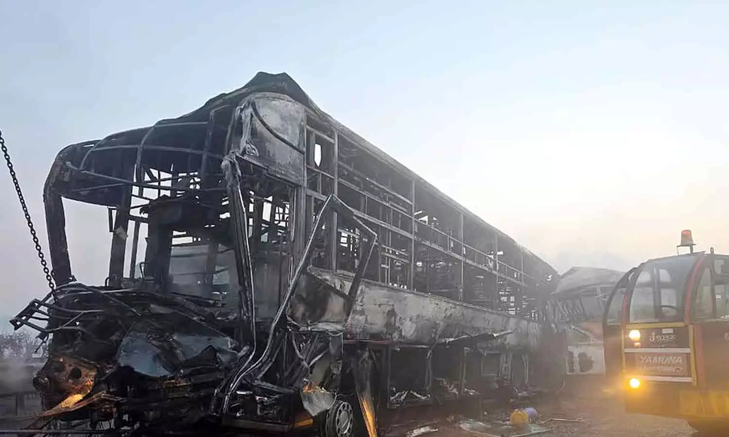 ബന്ദയിൽ നിന്ന് ഡൽഹിയിലേക്ക് പോവുകയായിരുന്ന ബസ് ആണ് അപകടത്തിൽപ്പെട്ടത്. ബ്രേക്ക് ജാമായതിനെ തുടർന്ന് ഫ്രിക്്ഷനാണ് തിപിടുത്തത്തിന് കാരണമെന്ന് ഫയർ ഫോഴ്‌സ് ഉദ്യോഗസ്ഥർ അറിയിച്ചു. തീപടരുന്നത് ശ്രദ്ധയിൽപ്പെട്ടയുടൻ യാത്രക്കാറെ പുറത്തിറക്കിയതിനാൽ വലിയ അപകടം ഒഴിവായി.