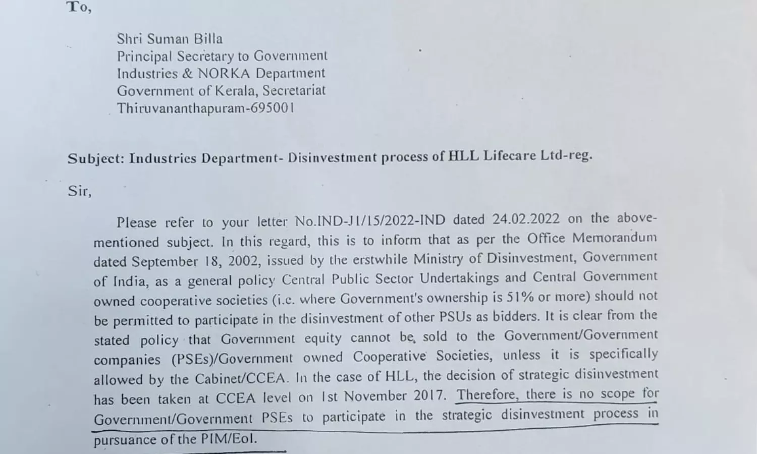 ഹിന്ദുസ്ഥാൻ ലാറ്റക്സ് ലിമിറ്റഡ് ലേലത്തില് പങ്കെടുക്കാന് സംസ്ഥാന സര്ക്കാരിന് അനുമതിയില്ല