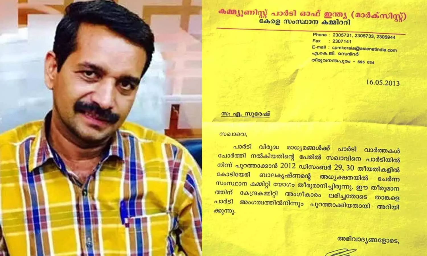 'ചെങ്കൊടി പുതച്ച് കിടക്കാനുള്ള ആഗ്രഹത്തിലാണ് കാത്തിരുന്നത്, തിരിച്ചെടുക്കാന് അയോഗ്യത എന്തായിരുന്നു'; തുറന്ന കത്തുമായി എ. സുരേഷ്