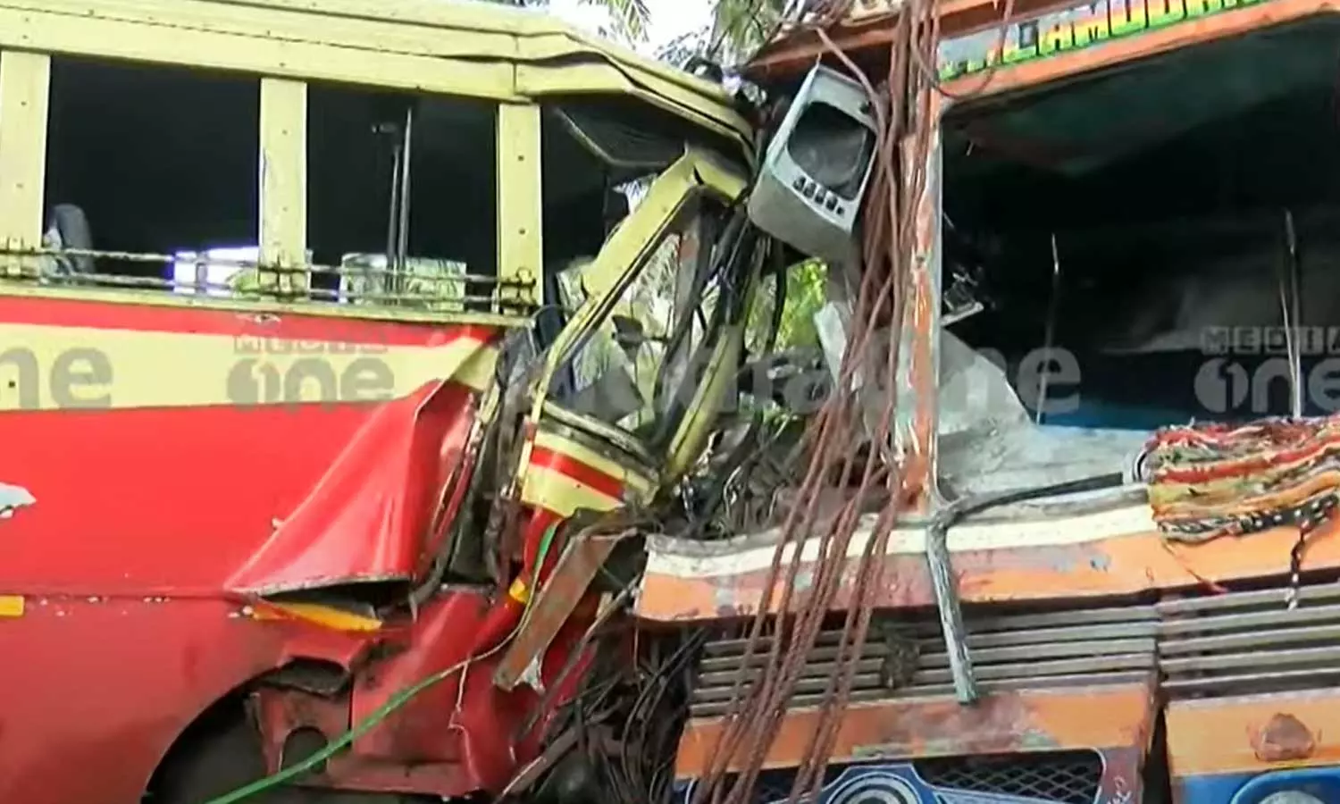16പേരെ മെഡിക്കൽ കോളജിൽ പ്രവേശിപ്പിച്ചു. വാഹനത്തിൽ കുടുങ്ങിയ ഡ്രൈവർമാരെ വണ്ടി വെട്ടിപൊളിച്ചാണ് പുറത്തെടുത്തത്. ഇന്ന് രാവിലെ 6.15 ഓടെയാണ് അപകടമുണ്ടായത്. ആശുപത്രിയില്‍ പ്രവേശിപ്പിച്ച ആരുടെയും പരിക്ക് ഗുരുതരമല്ലെന്നാണ് വിവരം. കര്‍ണാടകയില്‍ നിന്ന് ചരക്കുമായി വന്ന ലോറിയും കാട്ടാക്കടയില്‍ നിന്ന് പത്തനംതിട്ട മൂഴിയാറിലേക്ക് പോകുന്ന കെഎസ്ആര്‍ടിസി ബസുമാണ് കൂട്ടിയിടിച്ചത്.40 മിനിറ്റോളം പണിപ്പെട്ടാണ് പൊലീസും ഫയര്‍ഫോഴ്സും ഡ്രൈവര്‍മാരെ വാഹനം വെട്ടിപ്പൊളിച്ച് പുറത്തെടുത്തത്.