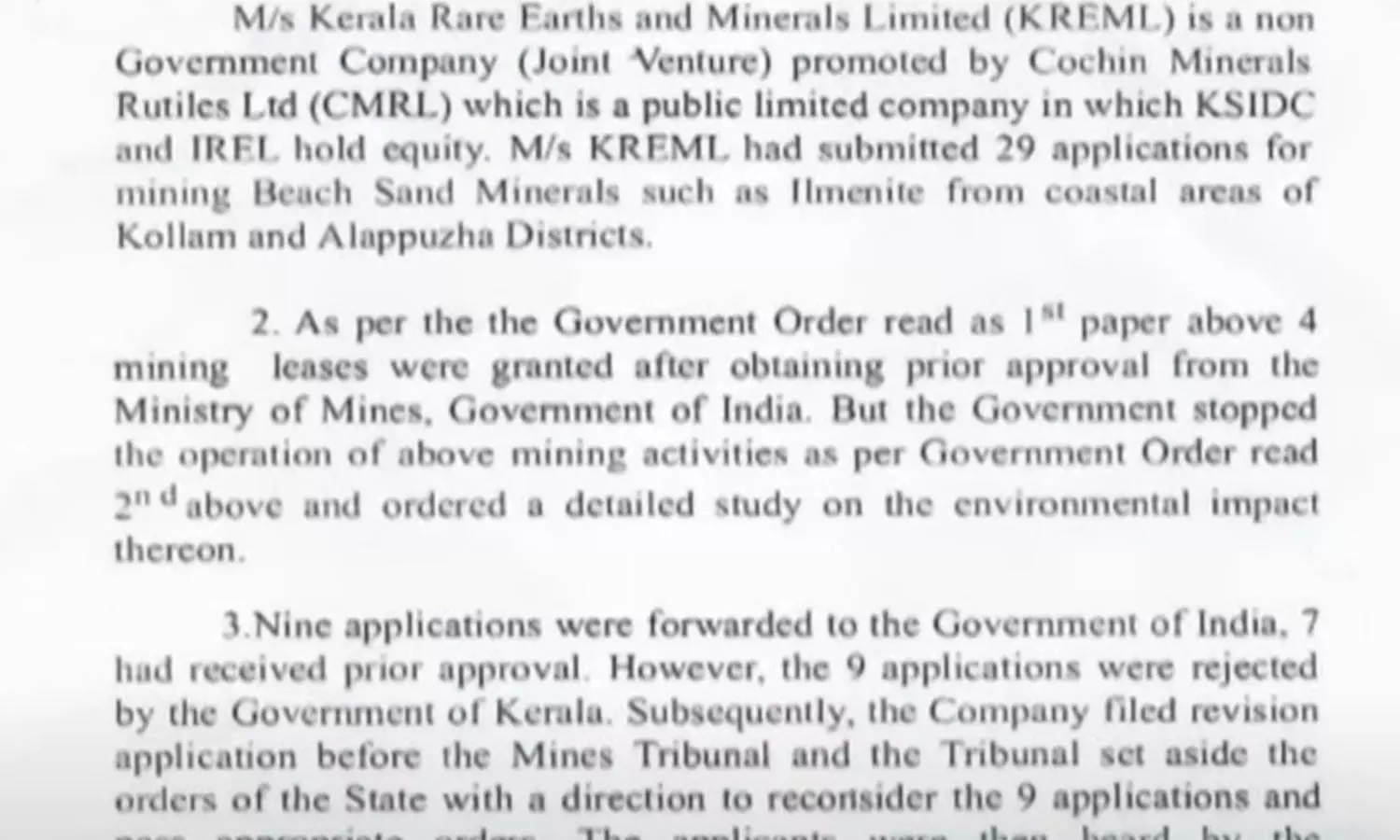 സി.എം.ആർ.എല്ലിന്റെ ഖനനാനുമതി റദ്ദാക്കിയത് മാസപ്പടി വിവാദത്തിന് ശേഷം