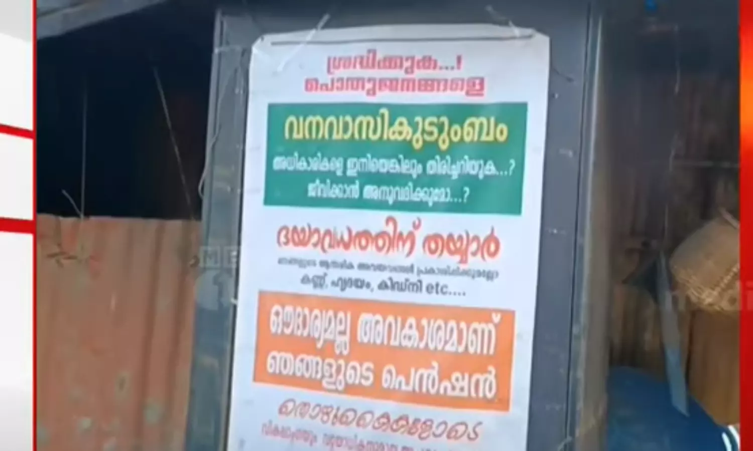 ഔദാര്യമല്ല അവകാശമാണ് പെൻഷൻ. അത് മുടങ്ങാതെ കിട്ടണം. ഇല്ലെങ്കിൽ ദയാവധത്തിന് തയ്യാർ. അമ്പലപ്പടിയിലെ പെട്ടിക്കടയിൽ ഇങ്ങനെയൊരു ബോർഡ് സ്ഥാപിച്ചാണ് 63 കാരിയായ ഓമനയുടെയും 72 വയസ്സുള്ള ഭർത്താവ് ശിവദാസിന്റെയും പ്രതിഷേധം. കുളമാൻകുഴി ആദിവാസി കോളനിയിൽ സ്ഥലമുണ്ടെങ്കിലും കാർഷികവിളകൾ കാട്ടാനക്കൂട്ടം നശിപ്പിച്ചതോടെ പടിയിറങ്ങി. പഞ്ചായത്ത് നൽകിയ പെട്ടിക്കടയിൽ തന്നെയാണ് ഇവരുടെ താമസം.