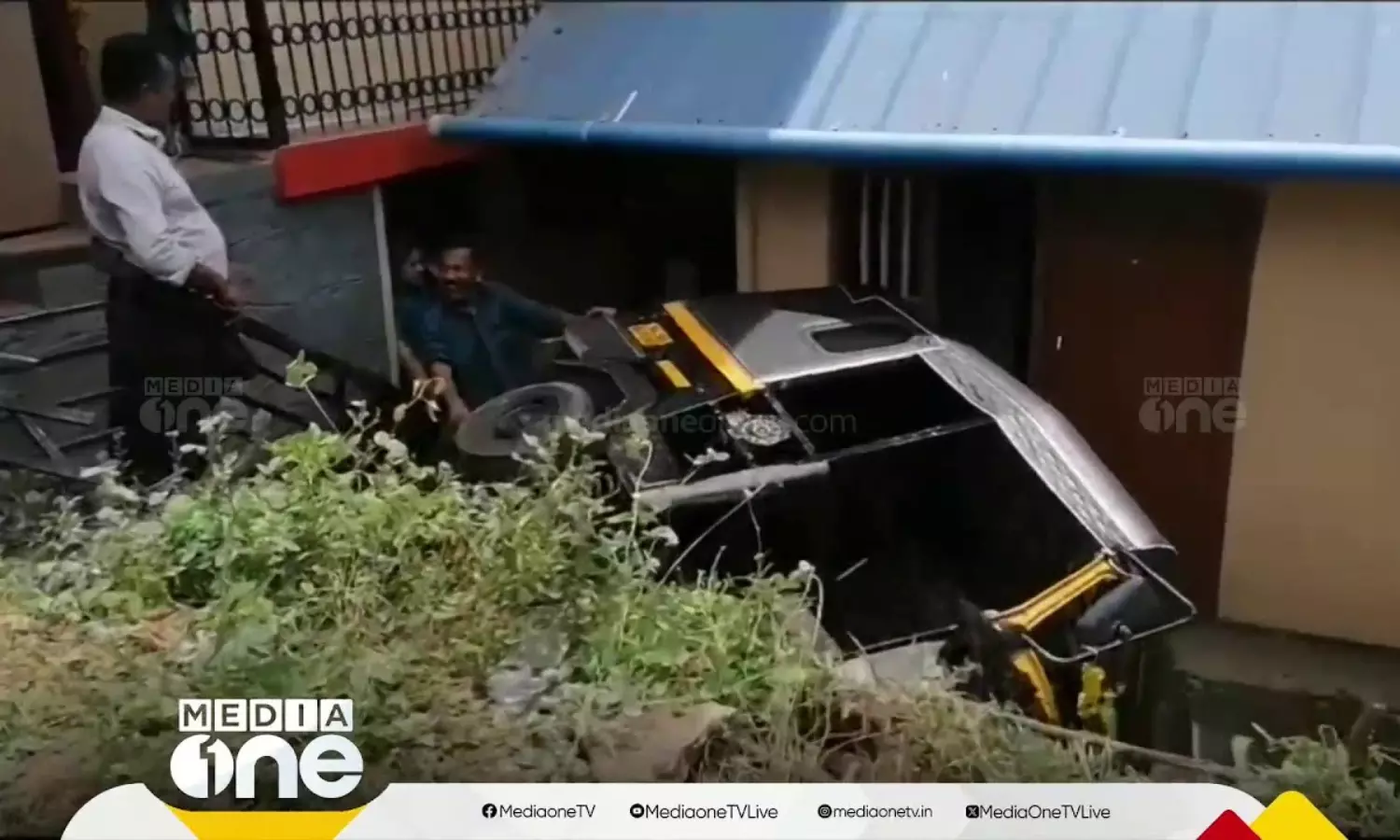 കുത്തനേയുള്ള ഇറക്കത്തില് നിയന്ത്രണം പോയി; ഓട്ടോറിക്ഷ വീടിന് മുന്നിലേക്ക് മറിഞ്ഞ് അപകടം