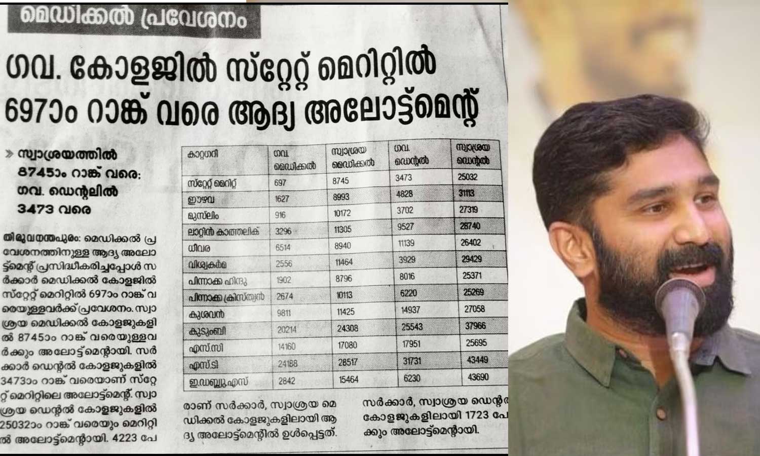 ''സ്റ്റേറ്റ് മെറ്റിറ്റിലെ 697ാം റാങ്ക് വരെയാണ് സംസ്ഥാനത്ത് ഗവ.മെഡിക്കൽ കോളേജിൽ എംബിബിഎസിന് പ്രവേശനം ലഭിച്ചത്. മുസ്ലിം സമുദായത്തിൽപ്പെട്ടവരിൽ 916 റാങ്കുകാർ വരെ പ്രവേശനം നേടി. ഈഴവ സമുദായത്തിൽപ്പെട്ടവരിൽ 1627 റാങ്ക് വരെ പ്രവേശനം നേടാനായി. മറ്റ് പിന്നാക്ക ഹിന്ദുക്കളുടേയും അവസ്ഥ ഇതിനടുത്ത് തന്നെയാണ്, 1902 റാങ്ക് വരെ. വിശ്വകർമ്മജരിൽ 2566 റാങ്ക് വരെ പ്രവേശനം നേടി. പിന്നാക്ക കൃസ്ത്യാനികൾക്കിടയിൽ നിന്ന് 2674 റാങ്ക് വരെയാണ് പ്രവേശനപ്പട്ടികയിൽ ഇടംപിടിച്ചത്.