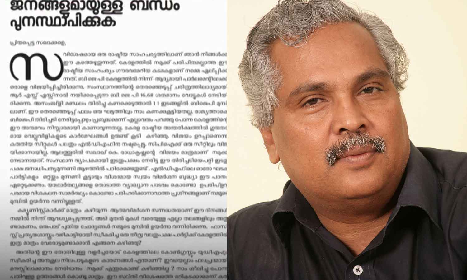 കേരളത്തിൽ ബിജെപി ജയിച്ചത് നിസ്സാരമായി കാണാവുന്നതല്ല, കേരള രാഷ്ട്രീയത്തിൽ ഗുരുതരമായ വെല്ലുവിളികളുടെ കാർമേഘങ്ങൾ ഉരുണ്ടു കൂടിയിട്ടുണ്ട്. തീവ്ര വലതുപക്ഷ പാർട്ടിയായ ബിജെപിക്ക് എങ്ങനെയാണ് കേരളത്തിൽ ഇത്രമാത്രം വേരോട്ടം ഉണ്ടാക്കാൻ കഴിഞ്ഞത്..സംസ്ഥാനത്തെ സാമൂഹ്യ അന്തരീക്ഷത്തെ എന്തുകൊണ്ട് ഇടതുപക്ഷത്തിന് മനസ്സിലാക്കാൻ കഴിഞ്ഞില്ല. ഇടതുപക്ഷത്തിനൊപ്പം ചേർന്ന് നിൽക്കുന്ന അടിസ്ഥാനവിഭാഗത്തോട് പാർട്ടിക്ക് ഇപ്പോഴും ബന്ധമുണ്ടോ?" കത്തിൽ പാർട്ടി സെക്രട്ടറി ചൂണ്ടിക്കാട്ടി