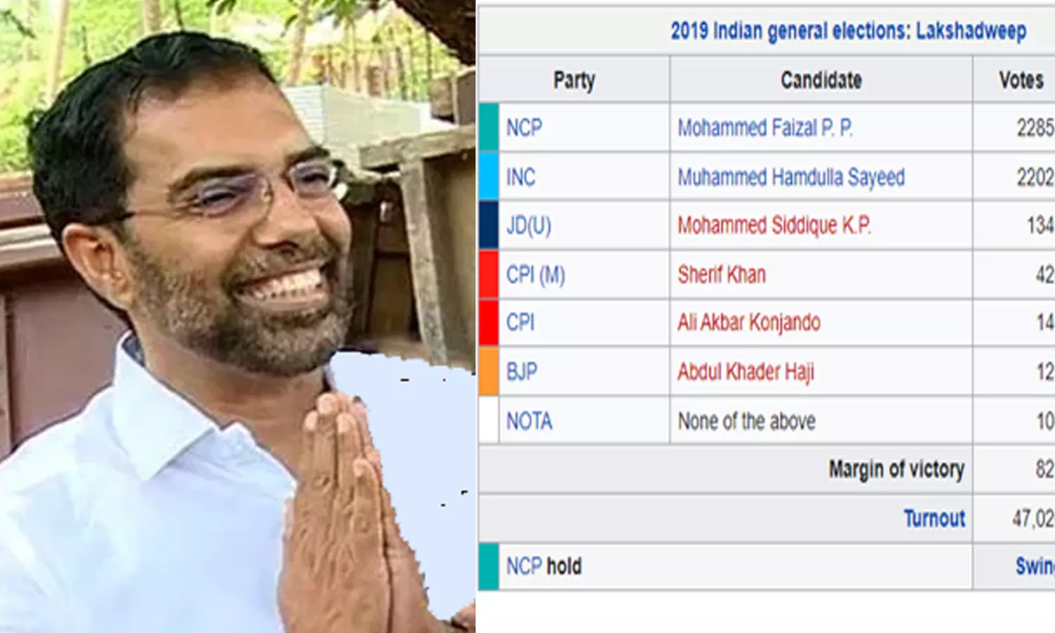 തെരഞ്ഞെടുപ്പ് കമ്മീഷന്റെ കണക്കുകള് പ്രകാരം 2019ലെ തെരഞ്ഞെടുപ്പില് ബി.ജെ.പി സ്ഥാനാര്ത്ഥിയായ അബ്ദുള് ഖാദര് ഹാജിക്ക് 125 വോട്ടാണ് ലഭിച്ചത്. എന്.സി.പി സ്ഥാനാര്ത്ഥിയായ മുഹമ്മദ് ഫൈസല് പി.പിക്ക് 22,851 വോട്ട് ലഭിച്ചപ്പോള് കോണ്ഗ്രസ് സ്ഥാര്ത്ഥി മുഹമ്മദ് ഹംദുള്ള സയിദിന് 22028 വോട്ടുകള് ലഭിച്ചു. ലക്ഷദ്വീപ് അഡ്മിനിസ്ട്രേറ്ററുടെ ജനവിരുദ്ധ നയങ്ങൾ തുറന്നുകാട്ടിയതിനാണ് ദ്വീപ് സ്വദേശിയും സിനിമ പ്രവർത്തകയുമായ ഐഷ സുൽത്താനക്കെതിരെ രാജ്യദ്രോഹ കുറ്റം ചുമത്തിയത് എന്ന വിമർശനവും വ്യാപകമാണ്.