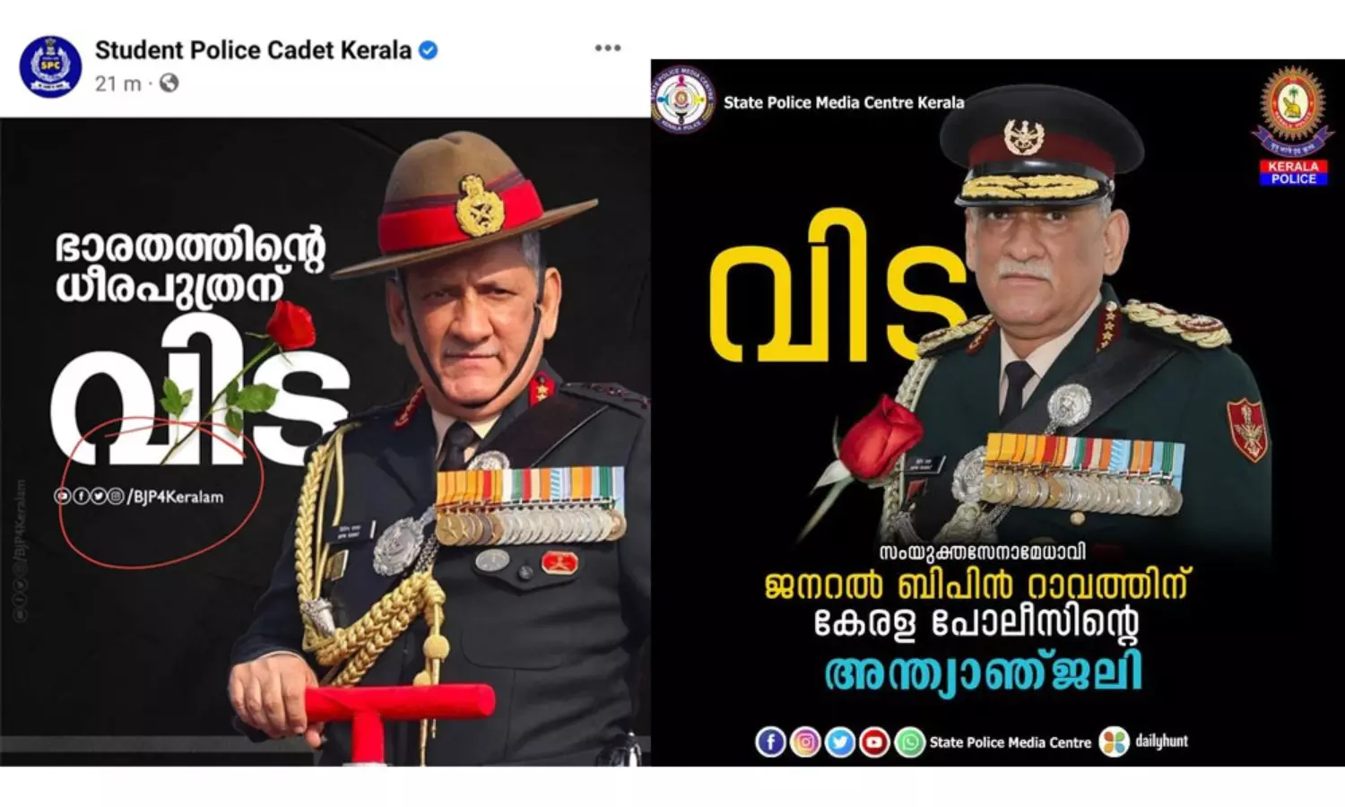 കേരള പൊലീസിന് കീഴിൽ പ്രവർത്തിക്കുന്ന സ്റ്റുഡന്റ് പൊലീസ് കേഡറ്റിന്റെ ഔദ്യോഗിക ഫേസ്ബുക്ക് പേജിൽ ബി.ജെ.പി പോസ്റ്റർ. സംയുക്ത സേന മേധാവി ബിപിൻ റാവത്തിന് ആദരാഞ്ജലികൾ അർപ്പിച്ച് കൊണ്ടുള്ള ബി.ജെ.പി കേരള ഘടകത്തിന്റെ പോസ്റ്ററാണ് സ്റ്റുഡന്റ് പൊലീസ് കേഡറ്റ് പേജിൽ പോസ്റ്റ് ചെയ്തത്.