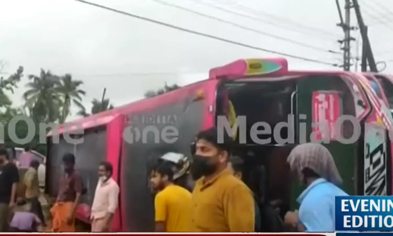 വലിയ വേഗതയിൽ പോയതിനെ തുടർന്ന് നിയന്ത്രണം വിട്ട് മറിയുകയായിരുന്നുവെന്നാണ് ദൃക്സാക്ഷികൾ പറയുന്നത്. ബസ് രണ്ട് തവണ മലക്കം മറിഞ്ഞുവെന്നും അവർ പറഞ്ഞു. പിന്നീട് ഫയർഫോഴ്സെത്തി നേരെയാക്കുകയായിരുന്നു. യാത്രക്കാരെ ബസ്സിൽ നിന്ന് മാറ്റിയിട്ടുണ്ട്. പരിക്കേറ്റവരെ ആശുപത്രിയിലേക്ക് മാറ്റിയിരിക്കുകയാണ്.