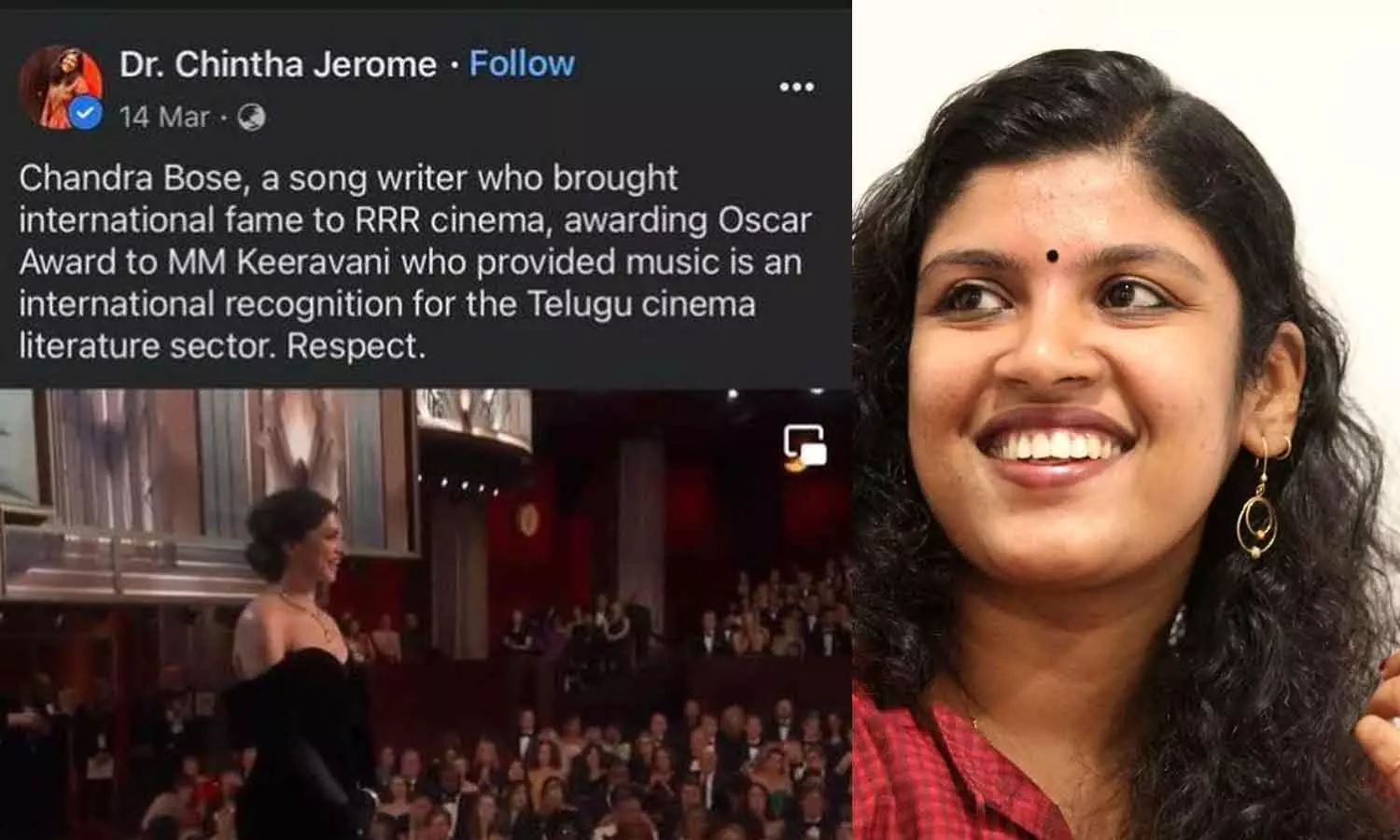 Chandra Bose, a song writer who brought international fame to RRR cinema, awarding Oscar Award to MM Keeravani who provided music is an international recognition for the Telugu cinema literature sector. Respect. എന്നാണ് ചിന്തയുടെ ഫേസ്ബുക്ക് പോസ്റ്റ്. ഇത് മലയാളത്തിലേക്ക് വിവർത്തനം ചെയ്താൽ,