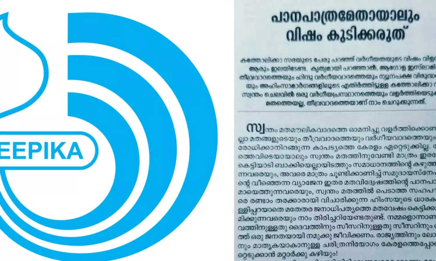 കത്തോലിക്കാ സഭയുടെ പേരു പറഞ്ഞ് വർഗീയതയുടെ വിഷം വിളമ്പാൻ ആരും ഇലയിടേണ്ട; വിമര്ശനവുമായി ദീപിക മുഖപ്രസംഗം