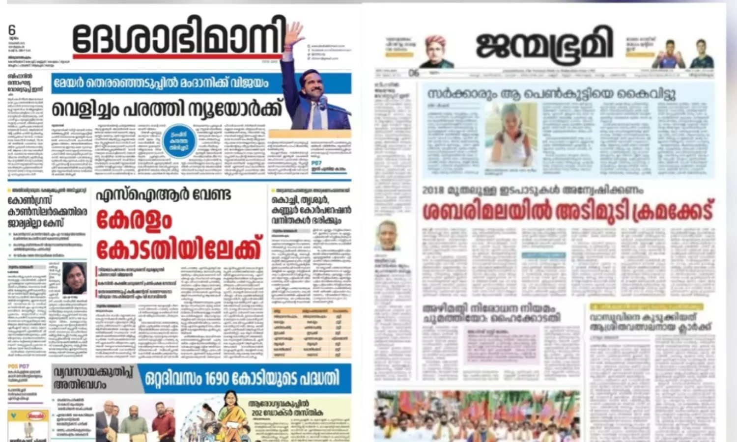കോഴിക്കോട്: ലോക്സഭാ പ്രതിപക്ഷ നേതാവ് രാഹുൽ ഗാന്ധി പുറത്തുവിട്ട ഹരിയാന നിയമസഭാ തെരഞ്ഞെടുപ്പിലെ വോട്ടർ പട്ടിക ക്രമക്കേടുകളുടെ വാർത്തകൾ ഉള്ളിലൊതുക്കി ദേശാഭിമാനിയും ജന്മഭുമിയും. ഇന്ത്യയിലെ തെരഞ്ഞെടുപ്പ് വ്യവസ്ഥയെ തന്നെ ചോദ്യം ചെയ്യുന്ന പ്രധാന വാർത്തയെ സിപിഎം മുഖപത്രം ദേശാഭിമാനി ഒൻപതാം പേജിലും ജന്മഭൂമി ഏഴാം പേജിലുമാണ് നൽകിയത്. രാഹുൽ ഗാന്ധി പുറത്തുവിട്ട വോട്ട് കൊള്ളയുടെ വർത്തയോടുള്ള ബിജെപി ആഭ്യന്തര വകുപ്പ് സഹമന്ത്രി കിരൺ റിജിജുവിന്റെ പ്രതികരണമാണ് ജന്മഭൂമിയിൽ വാർത്തയായത്. ബംഗാൾ സിപിഎമ്മിന്റെ മുഖപത്രം 'ഗണശക്തി' വോട്ട് കൊള്ളയുടെ വാർത്ത ഒന്നാം പേജിൽ നൽകിയപ്പോൾ പാർട്ടിയുടെ തമിഴ്നാട് മുഖപത്രം 'തീകതിരിൽ' വാർത്ത രണ്ടാം പേജിലേക്കൊതുങ്ങി.