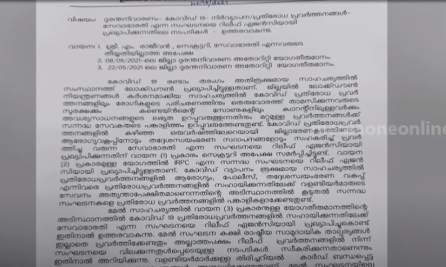 സേവാഭാരതിയെ കോവിഡ് റിലീഫ് ഏജന്സിയായി നിയോഗിച്ച തീരുമാനം ജില്ല ദുരന്തനിവാരണ അതോറിറ്റി റദ്ദ് ചെയ്തു