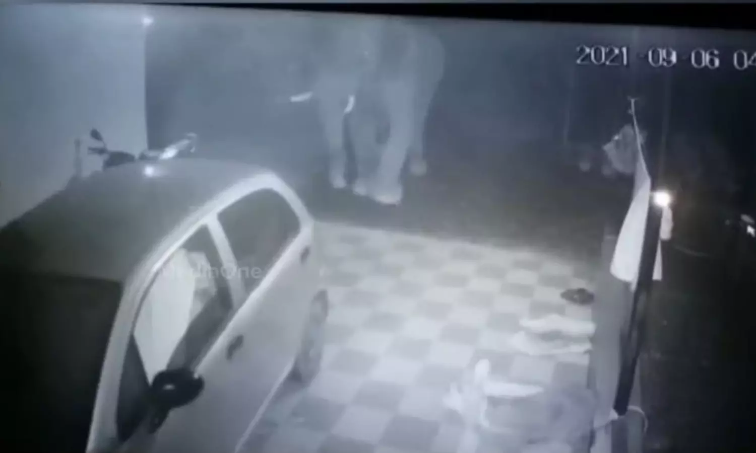 ഇന്ന് വെളുപ്പിന് പുരയിടത്തിൽ അതിക്രമിച്ച് കയറിയ ആന പോർച്ചിൽ കിടന്നിരുന്ന കാർ കുത്തിനശിപ്പിക്കുകയായിരുന്നു. ദൃശ്യം സിസിടിവിയില് പതിഞ്ഞു. ശബ്ദം കേട്ട് വീട്ടുകാർ ഉണർന്ന് നോക്കുമ്പോൾ ആന വീടിന്റെ മുന്നില് നിൽക്കുന്നതാണ് കണ്ടത്. വീട്ടുകാർ ഒച്ചവെച്ചതോടെ ആന പിൻവാങ്ങുകയായിരുന്നു. ആന പല പ്രാവശ്യം ഇവിടെ വന്നിട്ടുണ്ടെന്ന് വീട്ടുടമയായ വർഗീസ് പറഞ്ഞു.