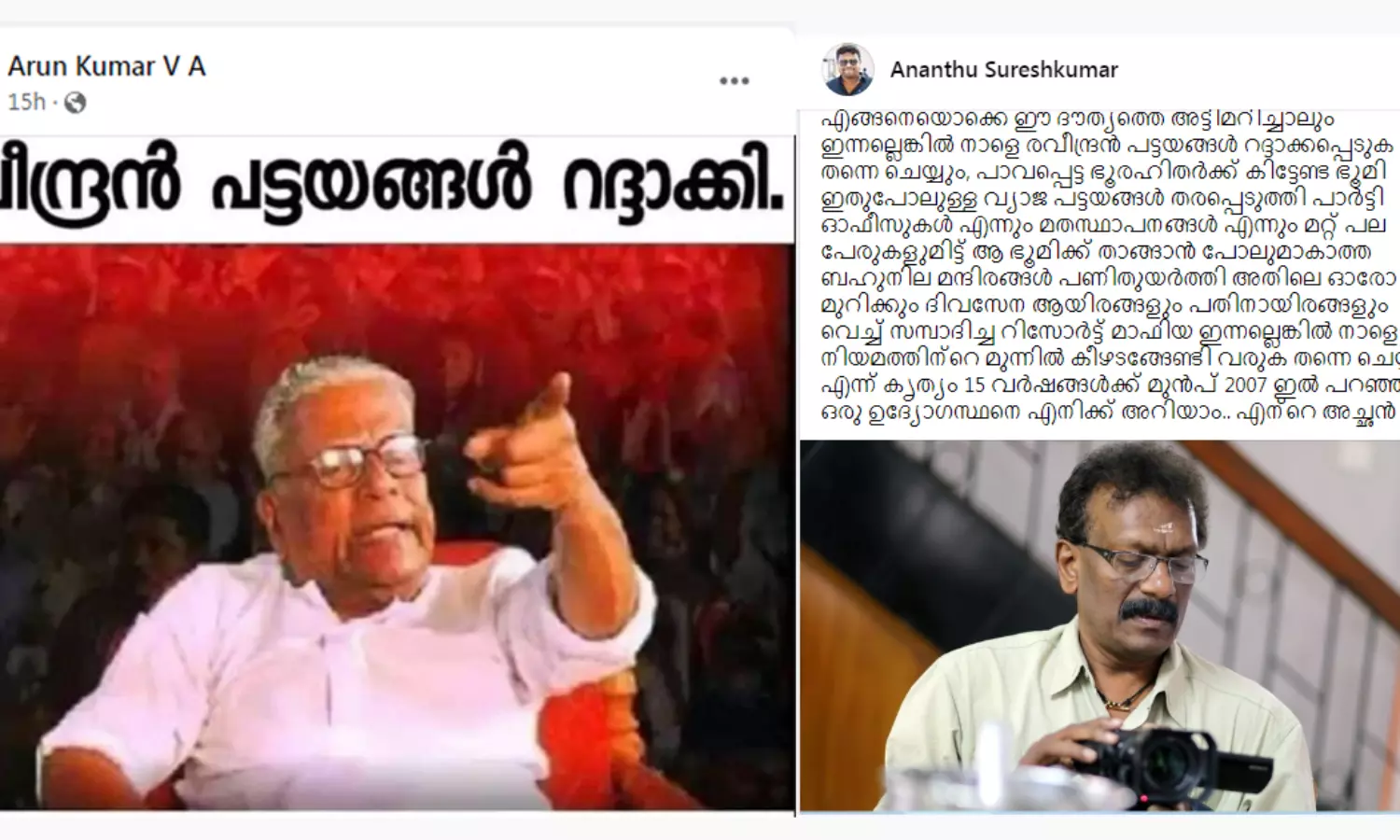 രവീന്ദ്രൻ പട്ടയങ്ങൾ റദ്ദാക്കാൻ നിലവിലെ സർക്കാർ തീരുമാനമെടുത്തതോടെ അന്നത്തെ തീരുമാനങ്ങൾ ശരിയാണെന്ന് സ്ഥാപിക്കാൻ ശ്രമിക്കുകയാണ് അക്കാലത്തെ മുഖ്യമന്ത്രി വി എസ് അച്യുതാനന്ദന്റെ മകനും മൂന്നാർ ദൗത്യത്തിന് നേതൃത്വം നൽകിയ സുരേഷ് കുമാറിന്റെ മകൻ അനന്ദുവും. അനധികൃതമായി നേടിയ ഭൂമി ഇന്നല്ലെങ്കിൽ നാളെ സർക്കാർ ഏറ്റെടുക്കുമെന്ന സുരേഷ് കുമാറിന്റെ പഴയ വാചകങ്ങൾ ഉദ്ധരിച്ചായിരുന്നു അനന്ദു സുരേഷ് കുമാറിന്റെ ഫേസ് ബുക്ക് പോസ്റ്റ്. വി.എസിന്റെ ചിത്രവും രവീന്ദ്രൻ പട്ടയം റദ്ദാക്കിയതിന്റെ വാർത്തയും ചേർത്തായിരുന്നു വി.എസിന്റെ മകൻ അരുൺ കുമാറിന്റെ ഫേസ് ബുക്ക് പോസ്റ്റ്. ഇരുവരുടെയും പോസ്റ്റിന് നിരവധി പേർ അഭിവാദ്യം അർപ്പിച്ചു.