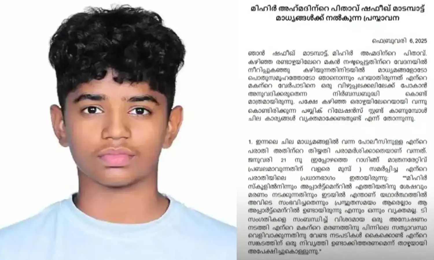 'മിഹിറിന്റെ അമ്മയും ബന്ധുക്കളും പറഞ്ഞതിൽ വൈരുധ്യമുണ്ട്. റാഗിങ് പരാതി പിആർ സ്റ്റണ്ടിന്റെ ഭാഗമാണ്. ജെംസ് സ്കൂളിൽ നിന്നും മിഹിറിനെ മാറ്റിയത് അവന്റെ താല്പര്യമില്ലാതെയാണ്. മിഹിറിന്റെ അവസ്ഥ വളരെ മോശമായിരുന്നു. സ്കൂളിൽ നിന്നും എത്തി മരിക്കുന്നത് വരെ മിഹിറിന് സംഭവിച്ചതെന്തെന്ന് കണ്ടെത്തണം. ആ സമയം ആരൊക്കെ അപ്പാർട്ട്മെന്റിൽ ഉണ്ടായിരുന്നു എന്ന് കണ്ടെത്തണം' - പിതാവ് പറഞ്ഞു.