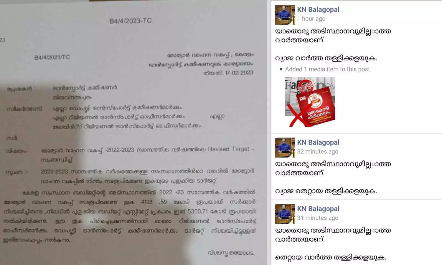 കോഴിക്കോട്: ഗതാഗത നിയമലംഘനങ്ങൾക്ക് പിഴയായി ഈ വർഷം 1000 കോടി രൂപ പിരിക്കണമെന്ന് മോട്ടോർ വാഹന വകുപ്പിന് നിർദേശം നൽകിയെന്ന വാർത്ത സംബന്ധിച്ച നിലപാടിൽ മലക്കംമറിഞ്ഞ് ധനകാര്യമന്ത്രി കെ.എൻ ബാലഗോപാൽ. മീഡിയവൺ റിപ്പോർട്ടിന്റെ കാർഡ് പങ്കുവെച്ചുകൊണ്ട് 'യാതൊരു അടിസ്ഥാനവുമില്ലാത്ത വാർത്ത, വ്യാജ വാർത്ത തള്ളിക്കളയുക' എന്നാണ് ആദ്യം ധനകാര്യമന്ത്രി ഫേസ്ബുക്ക് പോസ്റ്റിട്ടത്. പിന്നീട് ഇത് സംബന്ധിച്ച സർക്കുലർ പുറത്തുവിട്ടതോടെ 'യാതൊരു അടിസ്ഥാനവുമില്ലാത്ത വാർത്തയാണ്, തെറ്റായ വാർത്ത തള്ളിക്കളയുക' എന്ന് തിരുത്തുകയായിരുന്നു.