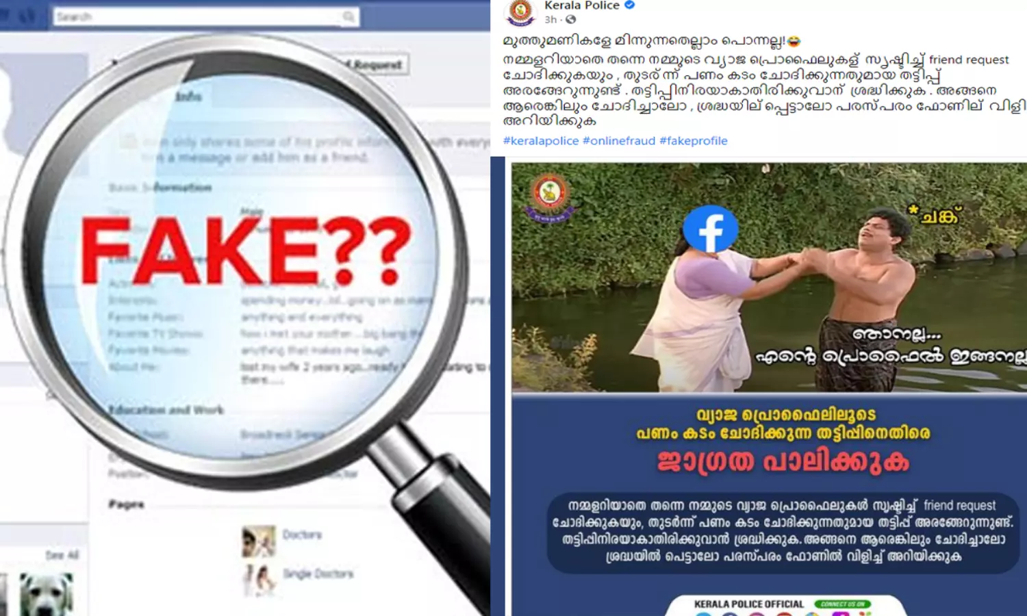 'മുത്തുമണികളേ മിന്നുന്നതെല്ലാം പൊന്നല്ല'; ഫേക്ക് പ്രൊഫൈൽ തട്ടിപ്പുകൾക്കെതിരെ കേരള പൊലീസിന്റെ മുന്നറിയിപ്പ്
