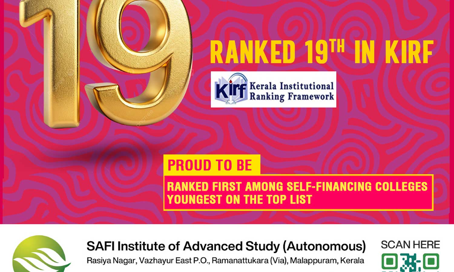 വാഴയൂർ (മലപ്പുറം): കേരളത്തിലെ ഉന്നത വിദ്യാഭ്യാസ സ്ഥാപനങ്ങളുടെ ഗുണ നിലവാരം അളക്കുന്ന സംവിധാനമായ കെഐആർഎഫ് റാങ്കിങ്ങിൽ മുന്നേറ്റമുണ്ടാക്കി വാഴയൂർ സാഫി ഇൻസ്റ്റിറ്റ്യൂട്ട് ഓഫ് അഡ്വാൻസ്ഡ് സ്റ്റഡി (ഓട്ടോണോമസ് ). സംസ്ഥാന റാങ്കിങ്ങിൽ 19-ാം സ്ഥാനമാണ് സാഫി സ്വന്തമാക്കിയത്.