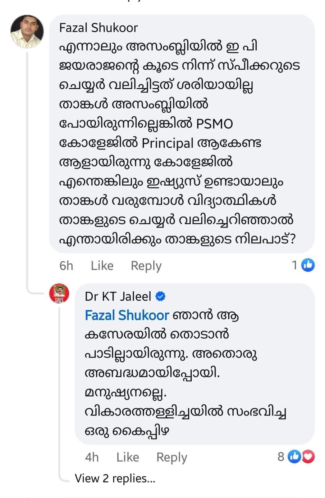 ''ഞാൻ ആ കസേരയിൽ തൊടാൻ പാടില്ലായിരുന്നു. അതൊരു അബദ്ധമായിപ്പോയി. മനുഷ്യനല്ലെ...വികാരത്തള്ളിച്ചയിൽ സംഭവിച്ച കൈപ്പിഴ''-ജലീൽ കുറിച്ചു.