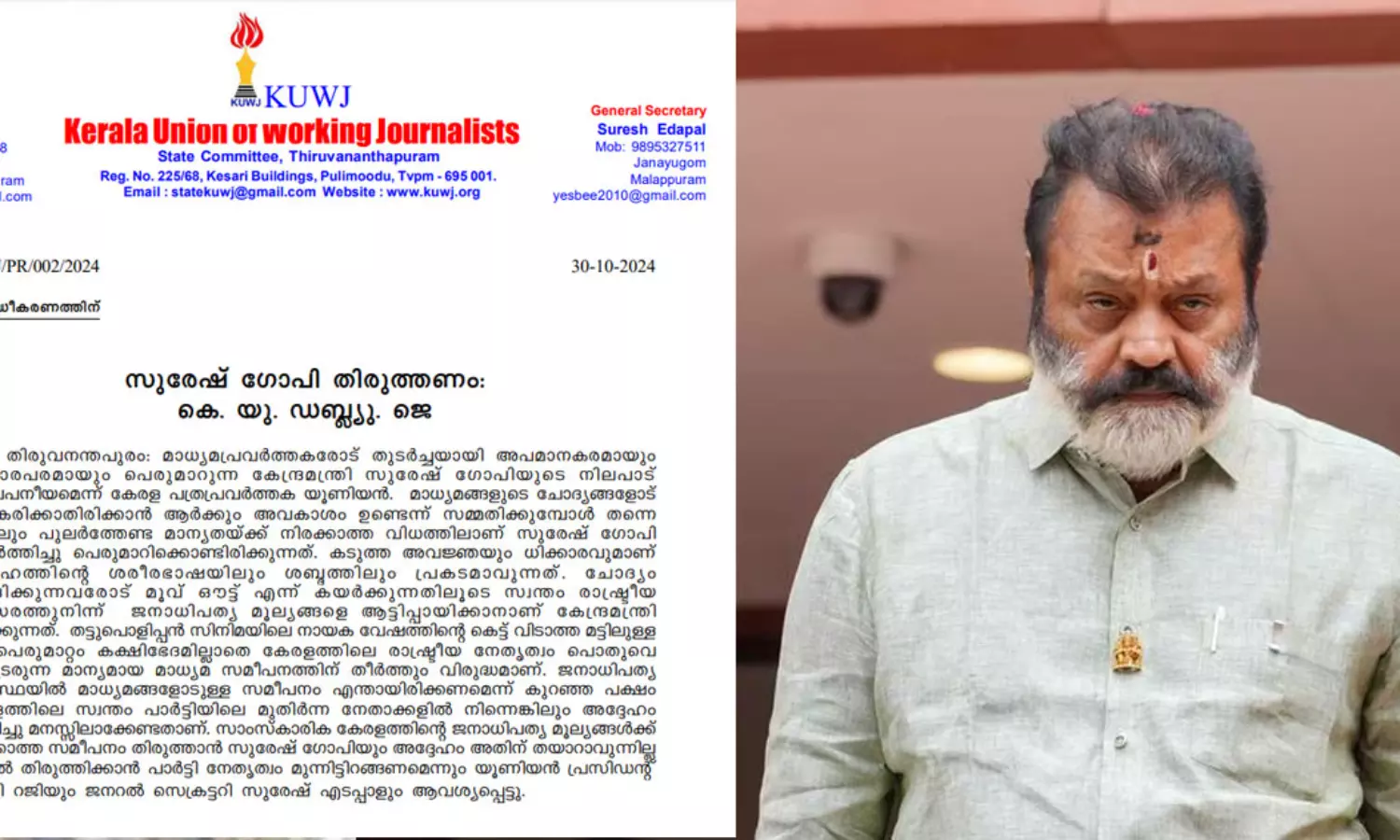 തട്ടുപൊളിപ്പൻ സിനിമയിലെ നായക വേഷത്തിൻ്റെ കെട്ട് വിടാത്ത മട്ടിലുള്ള പെരുമാറ്റം; സുരേഷ് ഗോപി തിരുത്തിയില്ലെങ്കില് പാര്ട്ടി തിരുത്തിക്കണമെന്ന് കെയുഡബ്ള്യൂജെ