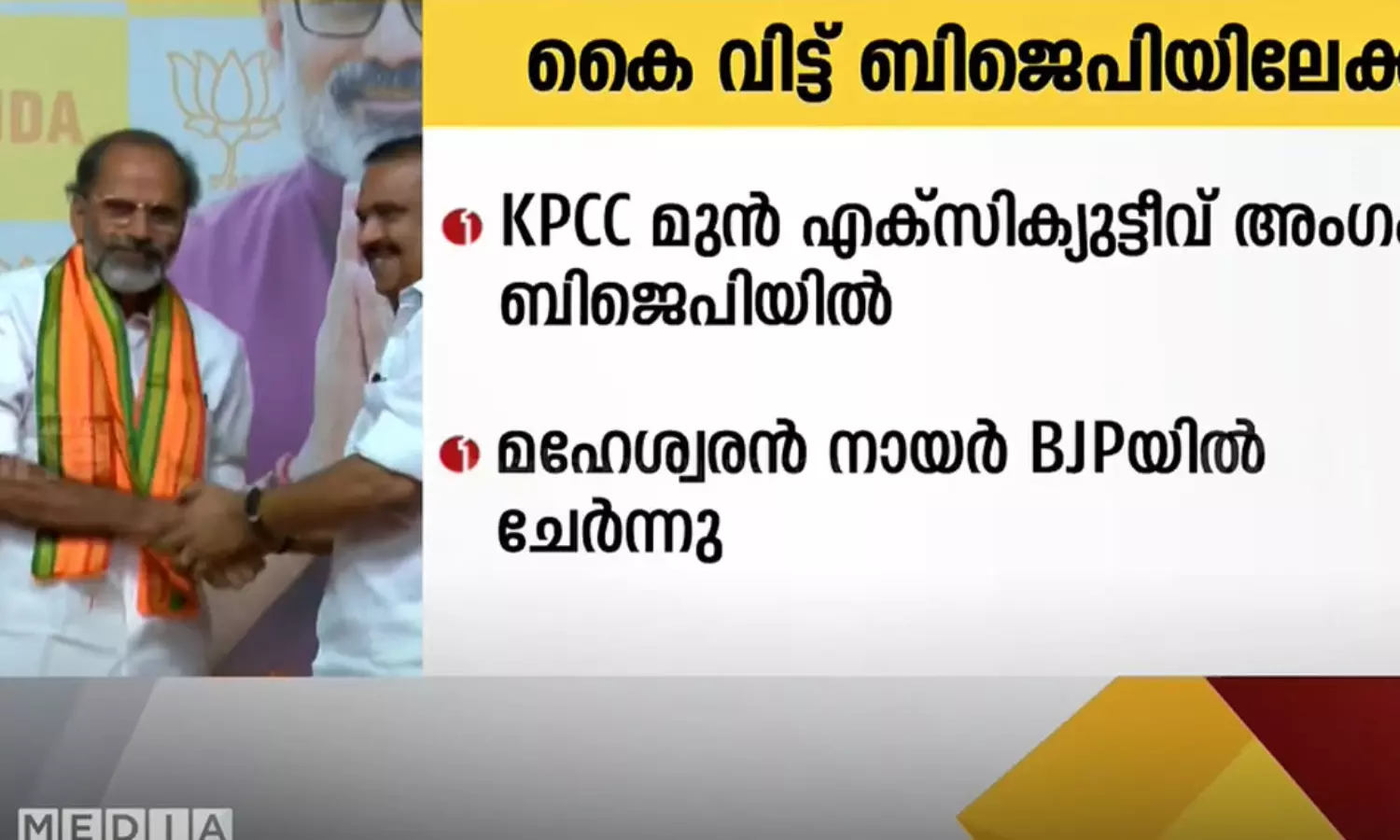 തിരുവനന്തപുരം:കെപിസിസിയുടെ മുൻ എക്സിക്യൂട്ടീവ് അംഗം മഹേശ്വരൻ നായർ ബിജെപിയിൽ ചേർന്നു. തിരുവനന്തപുരം നഗരസഭ മുൻ പ്രതിപക്ഷ നേതാവും കെ .കരുണാകരന്റെ വിശ്വസ്തനുമായിരുന്നു. കയ്പേറിയ അനുഭവങ്ങളല്ല കോൺഗ്രസ് വിടാൻ കാരണമെന്നും തിരുവനന്തപുരം നഗരസഭയുടെ ദീർഘവീക്ഷണത്തോടെയുള്ള വളർച്ചക്ക് വേണ്ടിയാണ് ബിജെപിയിലേക്ക് വന്നതെന്നും മഹേശ്വരൻ നായർ പറഞ്ഞു.