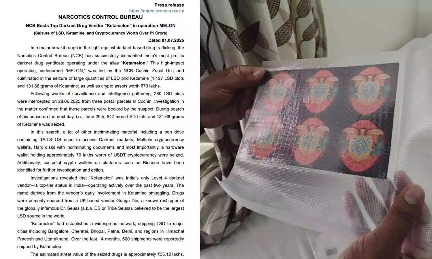 ഇന്നലെയാണ് കെറ്റാമെലോൺ എന്ന പേരിൽ പ്രവർത്തിച്ചിരുന്ന മയക്കുമരുന്ന് ശൃംഖലയെ കൊച്ചി എൻസിബി തകർത്തത്. നാല് മാസത്തെ അന്വേഷണത്തിനൊടുവിലാണ് ഡാർക്ക്നെറ്റ് മയക്കുമരുന്ന് ശൃംഖലയെ തകർത്തത്.