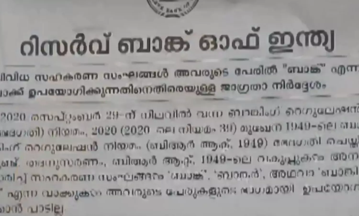 സഹകരണ സംഘങ്ങളുടെ പേരില്‍ 'ബാങ്ക്' വേണ്ട; മുന്നറിയിപ്പുമായി റിസര്‍വ് ബാങ്ക്