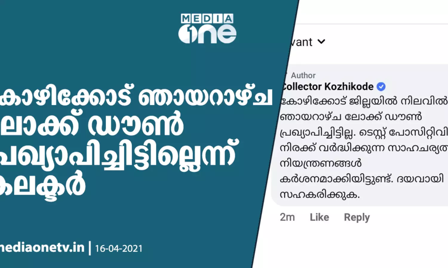 'കോഴിക്കോട് ജില്ലയിൽ നിലവിൽ ഞായറാഴ്ച ലോക്ക് ഡൗൺ പ്രഖ്യാപിച്ചിട്ടില്ല. ടെസ്റ്റ് പോസിറ്റിവിറ്റി നിരക്ക് വർദ്ധിക്കുന്ന സാഹചര്യത്തില് നിയന്ത്രണങ്ങൾ കർശനമാക്കിയിട്ടുണ്ട്. ദയവായി സഹകരിക്കുക.' കലക്ടര് കമന്റില് കുറിച്ചു.