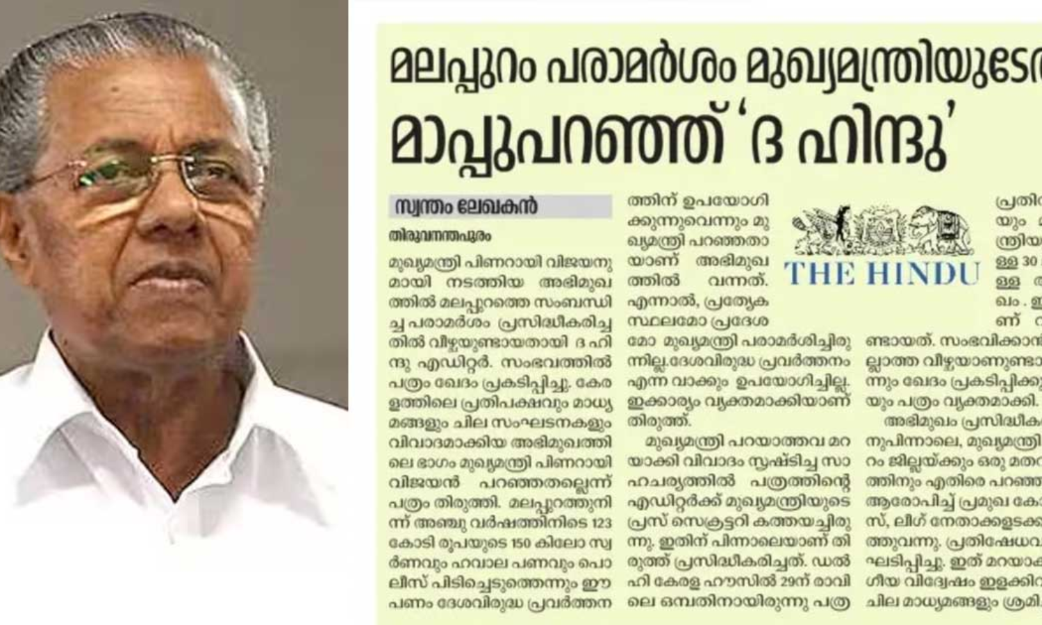 അതേസമയം മലപ്പുറം പരാമർശത്തിൽ 'ദ ഹിന്ദു' ദിനപത്രത്തിന്റെ മറുപടി വന്നതോടെ മുഖ്യമന്ത്രിയുടെ ഓഫീസും പ്രതിക്കൂട്ടിലായിരിക്കുകയാണ്. മുഖ്യമന്ത്രിയുടെ ഓഫീസ് അറിയാതെ,മലപ്പുറവുമായി ബന്ധപ്പെട്ട് വിഷലിപ്തമായ വാക്കുകൾ ഉൾപ്പെടുത്തണമെന്ന നിർദേശം പിആർ ഏജൻസി നൽകുമോ എന്ന ചോദ്യമാണ് ഉയരുന്നത്.