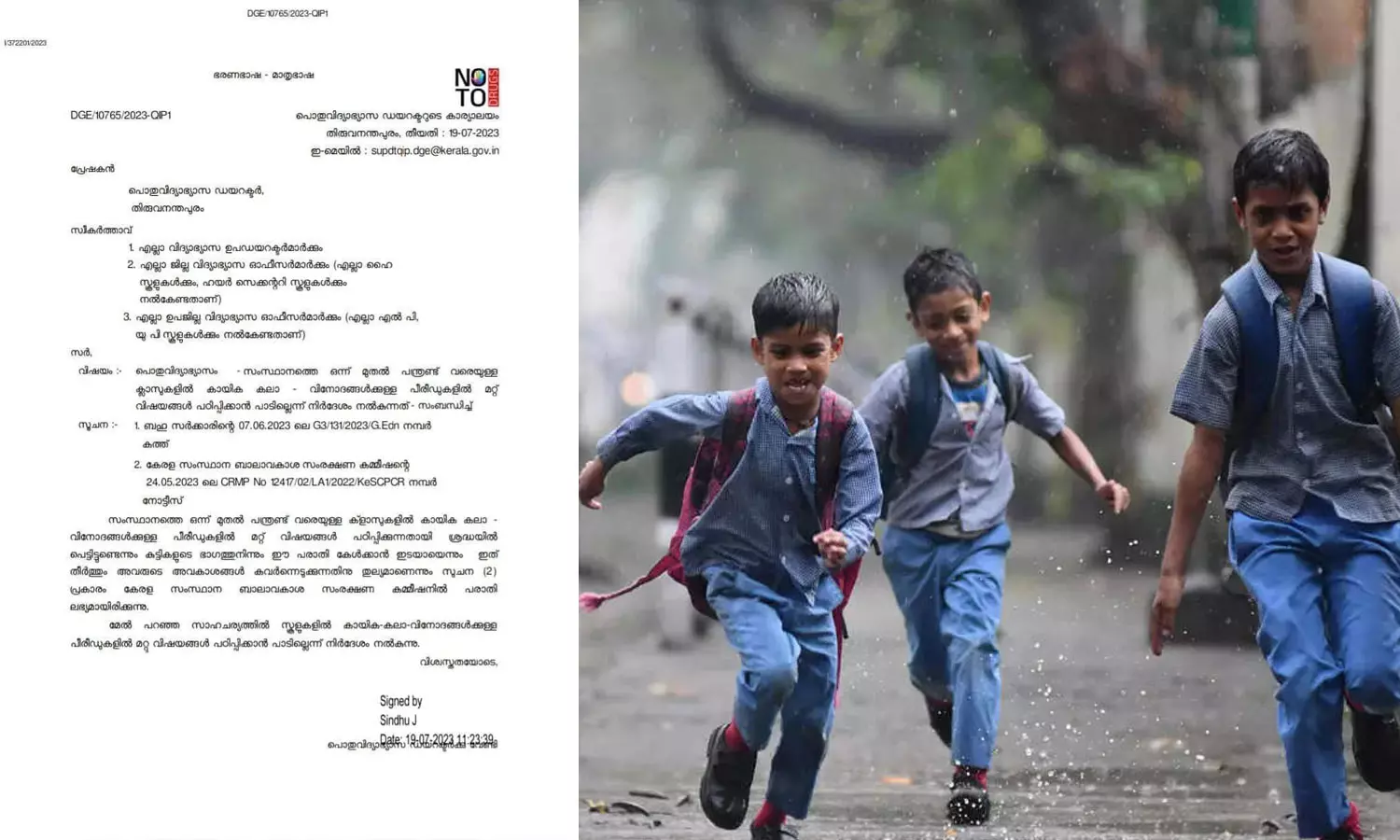 'സംസ്ഥാനത്തെ മൂന്ന് മുതൽ പന്ത്രണ്ട് വരെയുള്ള ക്ലാസ്സുകളിൽ കലാ-കായിക വിനോദങ്ങൾക്കുള്ള പീരിയഡുകളിൽ മറ്റ് വിഷയങ്ങൾ പഠിപ്പിക്കുന്നതായി ശ്രദ്ധയിൽപ്പെട്ടിട്ടുണ്ടെന്നും കുട്ടികളുടെ ഭാഗത്തു നിന്നും ഈ പരാതി കേൾക്കാൻ ഇടയായെന്നും ഇത് തീർത്തും അവരുടെ അവകാശങ്ങൾ കവർന്നെടുക്കുന്നതിന് തുല്യമാണെന്നും കേരള സംസ്ഥാന ബാലാവകാശ കമ്മിഷനിൽ പരാതി ലഭ്യമായിരിക്കുന്നു. ഈ സാഹചര്യത്തിൽ സ്കൂളുകളിൽ കലാ-കായിക വിനോദങ്ങൾക്കുള്ള പീരിയഡുകളിൽ മറ്റ് വിഷയങ്ങൾ പഠിപ്പിക്കാൻ പാടില്ലെന്ന് നിർദേശം നൽകുന്നു'- വിദ്യാഭ്യാസ ഡയറക്ടർ ഉത്തരവിൽ വ്യക്തമാക്കി.