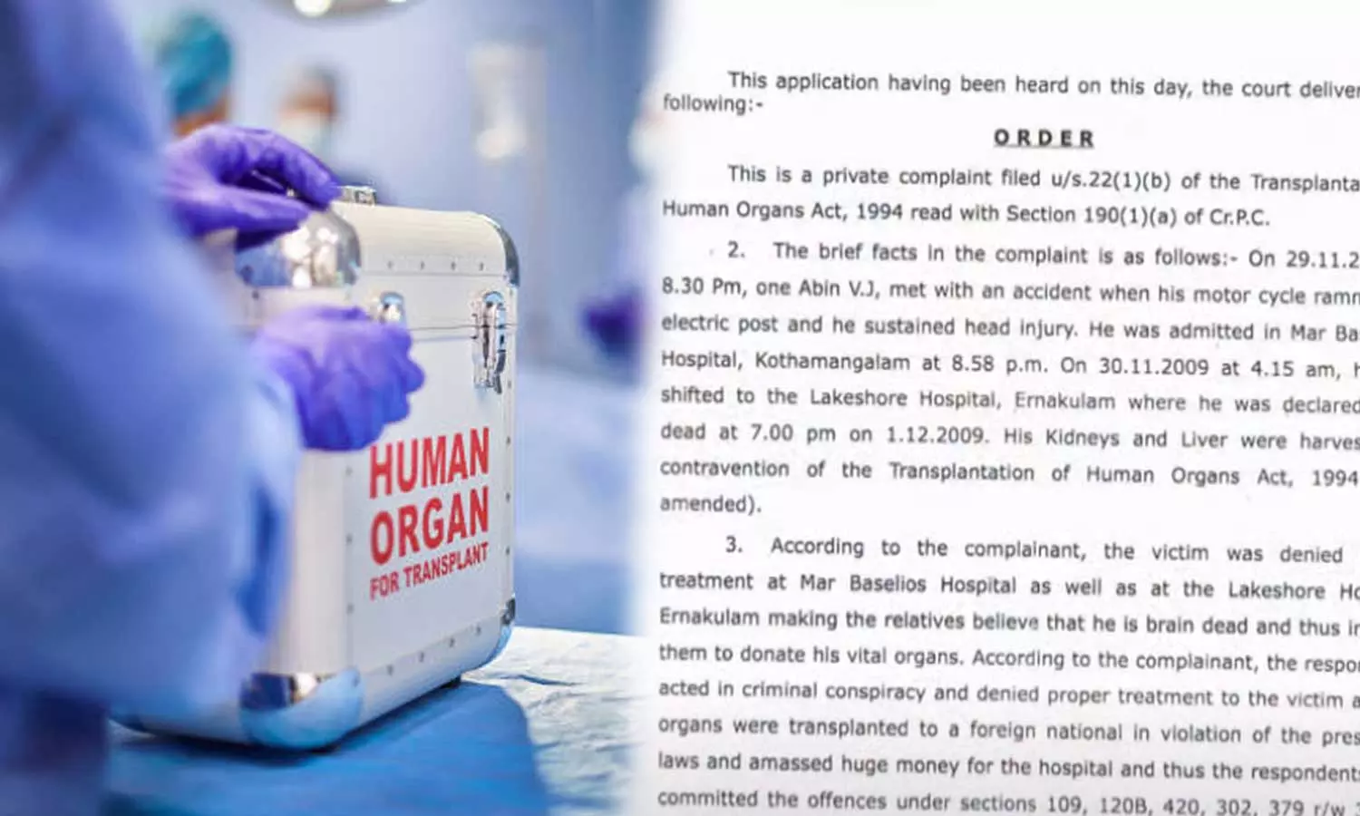 2009 നവംബറിൽ വാഹനാപകടത്തിൽ പരിക്കേറ്റ് ചികിത്സയിലാരിരുന്ന അബിൻ എന്ന യുവാവിൻ്റെ അവയവങ്ങളാണ് വിദേശിക്ക് മാറ്റിവെച്ചത്. മസ്തിഷ്ക മരണം സംഭവിക്കുന്നതിന് മുൻപ് അബിന് വിദഗ്ധ ചികിത്സ ലഭിച്ചില്ല എന്നായിരുന്നു പരാതി.