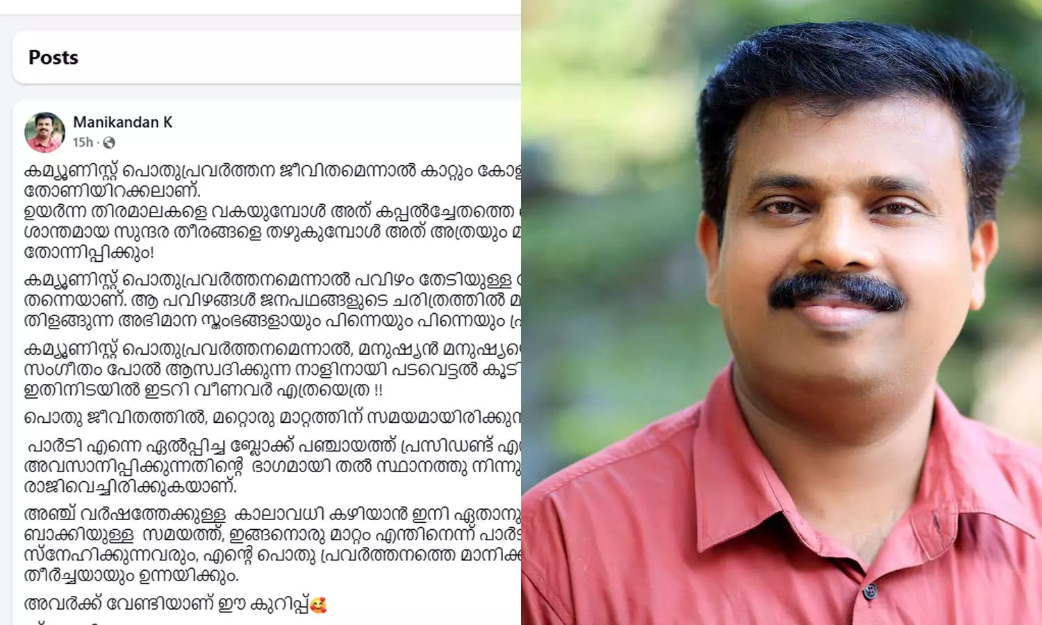 കമ്മീഷന്റെ അയോഗ്യത പ്രഖ്യാപനം ഒഴിവാക്കാനുള്ള മുന്കൂര് നീക്കമായാണ് ഇതിനെ വിലയിരുത്തുന്നത്. നേരത്തെ തന്നെ പാര്ട്ടി രാജിവെക്കുന്നതിലുള്ള അനുമതി മണികണ്ഠന് നല്കിയിരുന്നു. പക്ഷെ നിലമ്പൂര് ഇലക്ഷന് ശേഷം രാജി മതി എന്ന പാര്ട്ടി നിര്ദ്ദേശമനുസരിച്ചാണ് രാജിവെച്ചത് എന്നാണ് വിലയിരുത്തല്. വിശദമായ കുറിപ്പാണ് മണികണ്ഠന് ഫേസ്ബുക്കില് രേഖപ്പെടുത്തിയത്.