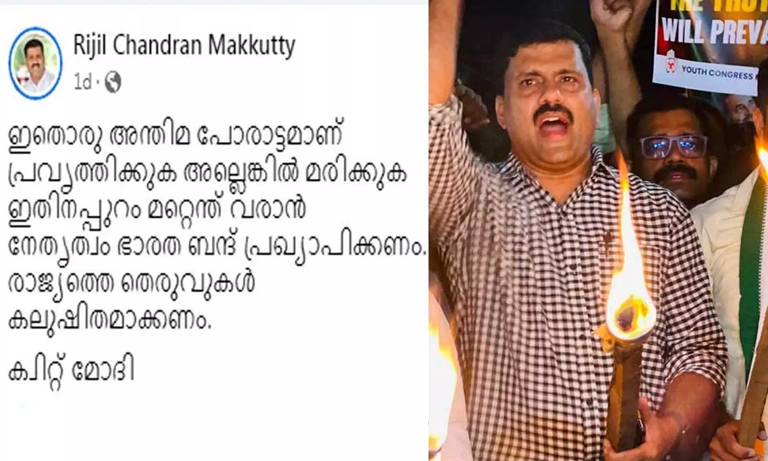 ഇന്നലെയാണ് യൂത്ത് കോൺഗ്രസ് നേതാവ് റിജിൽ മാക്കുറ്റിക്കെതിരെ കേസെടുത്തത്. ഫേസ്ബുക്കിൽ കലാപാഹ്വാനം നടത്തിയെന്ന പരാതിയിലാണ് കേസെടുത്തത്. കണ്ണൂർ ടൗൺ പൊലീസാണ് കേസെടുത്തത്. രാഹുലിനെ അയോഗ്യനാക്കിയതിന് പിന്നാലെയാണ് ഫേസ്ബുക്ക് കുറിപ്പ് പങ്കുവെച്ചത്. തെരുവുകൾ കലുഷിതമാക്കണമെന്നായിരുന്നു പോസ്റ്റ്. ബി.ജെ.പി നേതാവിന്റെ പരാതിയിലാണ് കേസെടുത്തത്