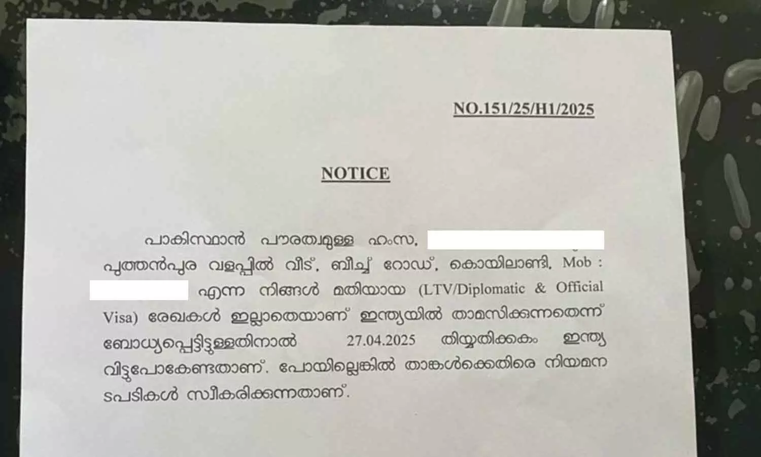 27ന് മുമ്പ് രാജ്യം വിടണം; കോഴിക്കോട് പാക് പൗരത്വമുള്ള 4 പേർക്ക് പൊലീസ് നോട്ടീസ്