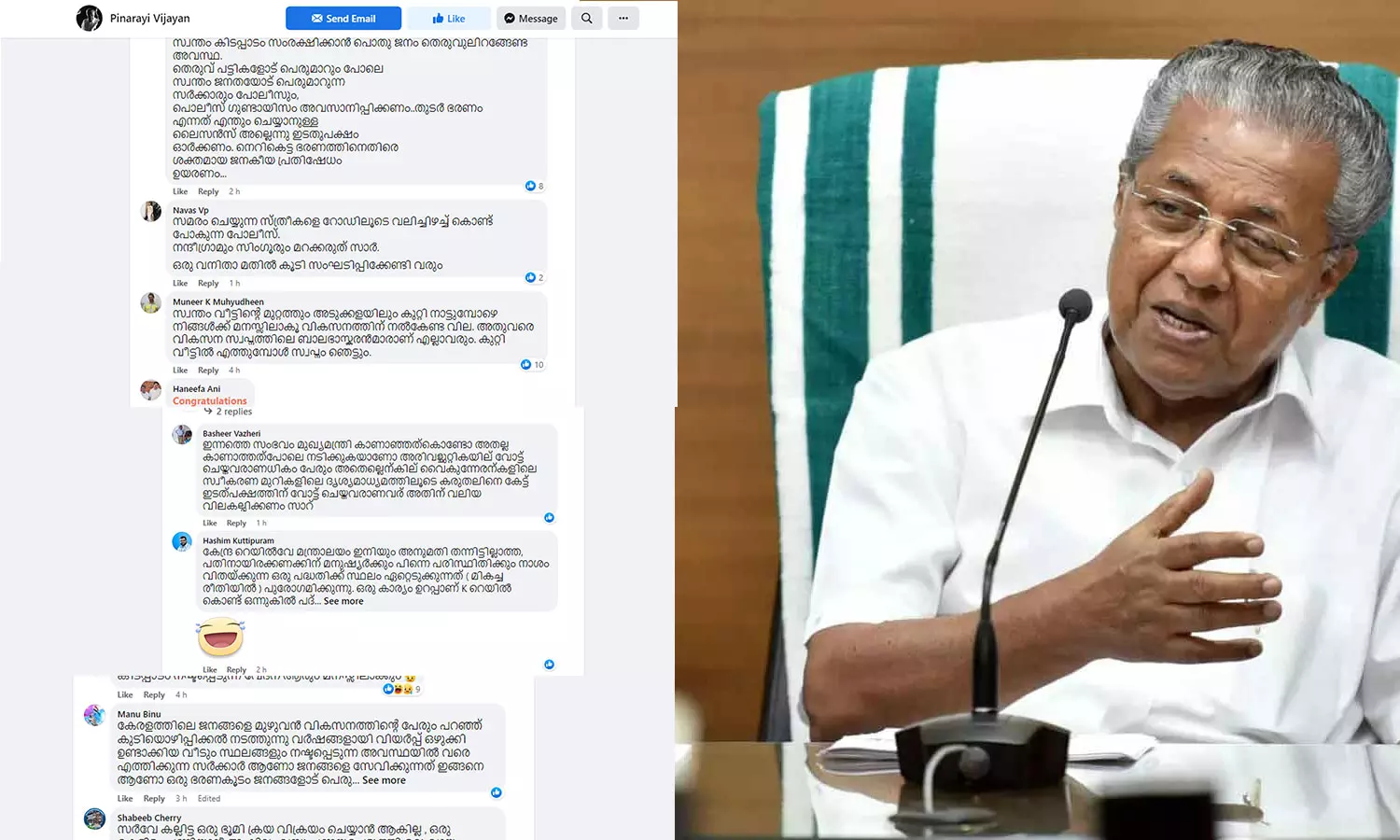 ' അധികാരത്തിന്റെ അഹന്ത മുഖ്യമന്ത്രി കാണിക്കരുത്. അങ്ങ് ദാഷ്ട്യം അവസാനിപ്പിക്കണം. കെ റെയിൽ പദ്ധതിയുടെ പേരിൽ പോലീസിനെ ഉപയോഗിച്ച് കേരളത്തിലെ സാധാരണ ജനങ്ങളെ അടിച്ചമർത്തരുത്. സമരം ചെയ്യുന്നത് മുഴുവൻ കോൺഗ്രസുകാരും ബിജെപിക്കാരും അല്ല എന്ന തിരിച്ചറിവ് അങ്ങേക്ക് ഉണ്ടാകണം.' - ചിലർ എഴുതി