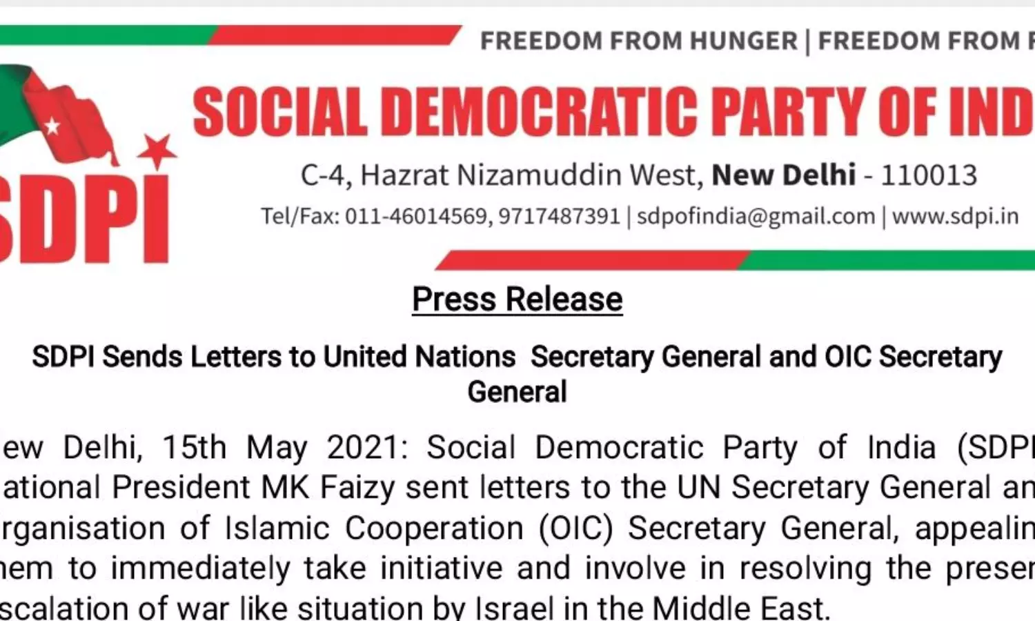 ഇസ്രായേൽ ആക്രമണം അവസാനിപ്പിക്കണം: ഐക്യരാഷ്ട്രസഭക്കും ഓഐസിക്കും എസ്ഡിപിഐ കത്തെഴുതി