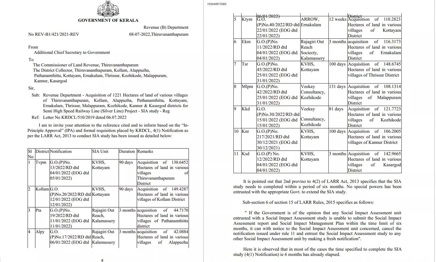 റവന്യൂ വകുപ്പ് ചീഫ് സെക്രട്ടറി ഈ മാസം എട്ടിന് ജില്ലാ കലക്ടർമാർക്ക് സാമൂഹിഘാകാത പഠനവുമായി ബന്ധപ്പെട്ട് അയച്ച കത്തിലാണ് ഇക്കാര്യമുള്ളത്. ആറ് മാസമാണ് സാമൂഹികാഘാത പഠനത്തിന്റെ കാലാവധി. ഇത് കഴിഞ്ഞാൽ പഠനം നീട്ടാനാവില്ല എന്നാണ് അഡീഷണൽ ചീഫ് സെക്രട്ടറിയുടെ വിശദീകരണം.