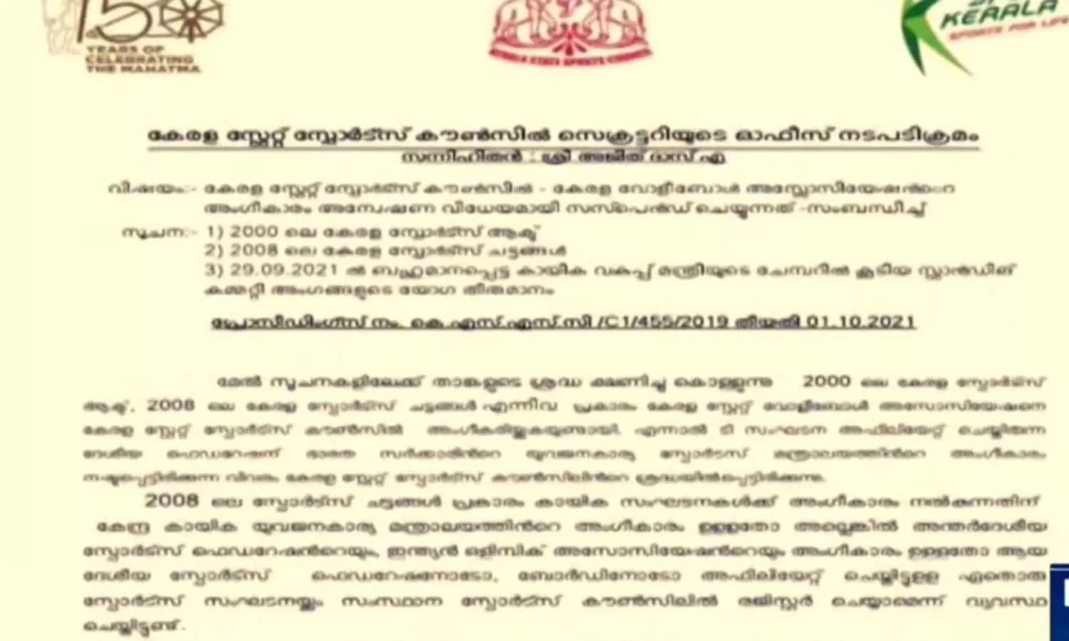 സംസ്ഥാന വോളിബോൾ അസോസിയേഷനെ സസ്പെൻഡ് ചെയ്തു. സ്പോർട്സ് കൗൺസിലിന്റേതാണ് നടപടി. ദേശീയ ഫെഡറേഷന്റെ അംഗീകാരം നഷ്ടപ്പെട്ടതിനെ തുടർന്നാണ് വോളിബോൾ അസോസിയേഷനെ സസ്പെൻഡ് ചെയ്തത്. സംസ്ഥാന വോളിബാൾ അസോസിയേഷൻ അഫിലിയേറ്റ് ചെയ്തിരിക്കുന്നത് ദേശീയ വോളിബാൾ ഫെഡറേഷനിലാണ്.