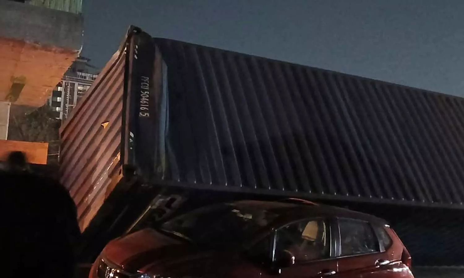 കാറിന് മുകളിലേക്ക് കണ്ടെയ്നർ മറിഞ്ഞു; യാത്രക്കാർ രക്ഷപ്പെട്ടത് തലനാരിഴയ്ക്ക്
