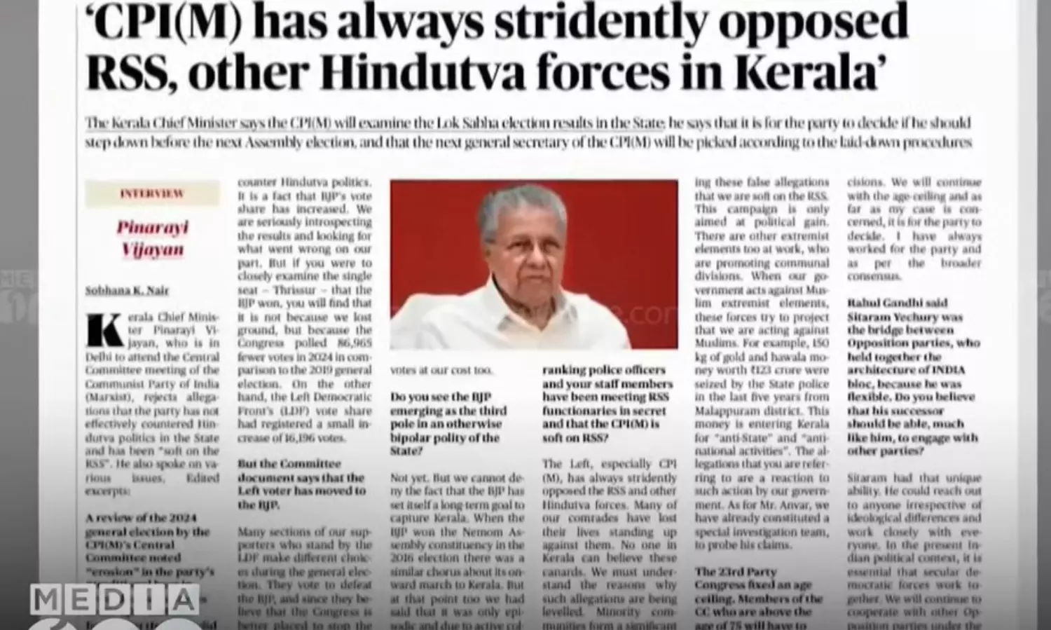 മുഖ്യമന്ത്രി പറയാത്ത കാര്യങ്ങളാണ് മലപ്പുറവുമായി ബന്ധപ്പെട്ട് ഹിന്ദു പത്രത്തിന്റെ അഭിമുഖത്തിൽ വന്നതെന്ന് മുഖ്യമന്ത്രിയുടെ ഓഫീസ് വ്യക്തമാക്കിയിരുന്നു