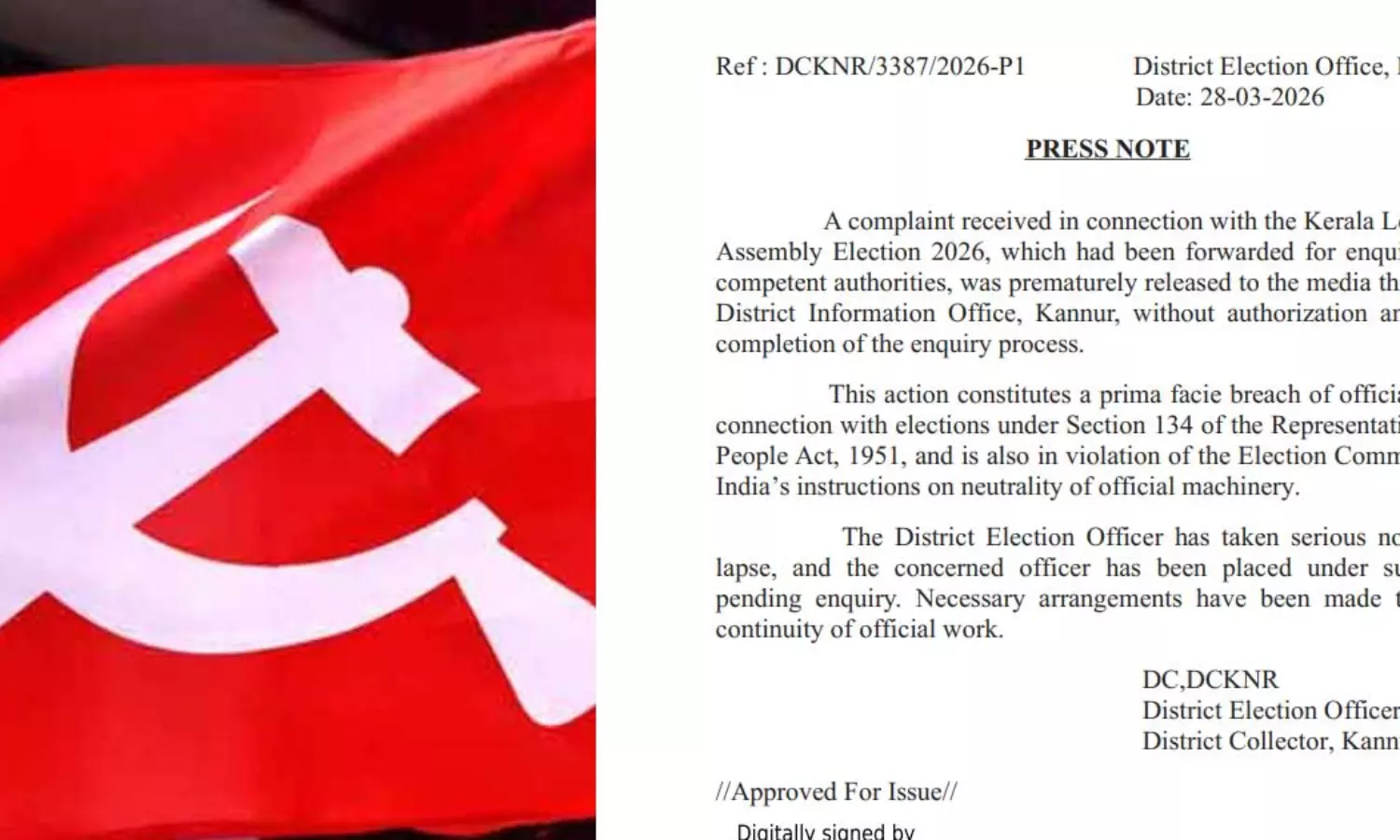കണ്ണൂർ അഴീക്കോട് മണ്ഡലത്തിലെ എൽഡിഎഫ് സ്ഥാനാർഥി കെ.വി സുമേഷ് നൽകിയ പരാതി സംബന്ധിച്ചായിരുന്നു വാർത്താ കുറിപ്പ്. തെരഞ്ഞെടുപ്പ് ചട്ടങ്ങൾ ലംഘിക്കപ്പെട്ടുവെന്ന് പ്രാഥമിക കണ്ടെത്തൽ. മുഖ്യ തെരഞ്ഞെടുപ്പ് ഓഫീസർ റിപ്പോർട്ട് നേടിയതിനു പിന്നാലെയാണ് നടപടി.