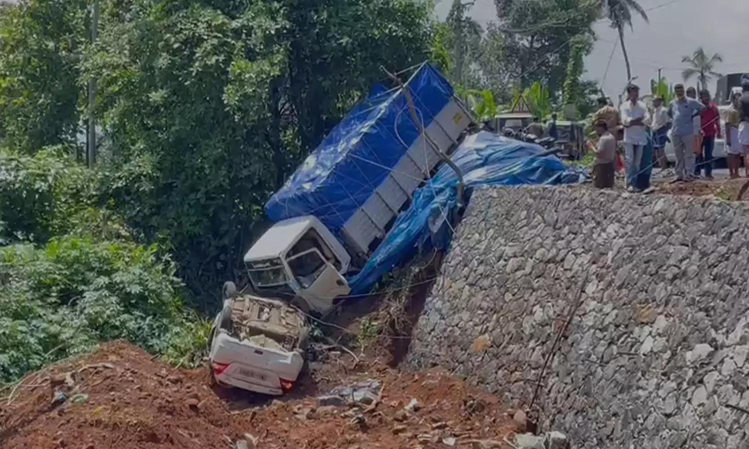 നിയന്ത്രണം വിട്ട ലോറി ബൈക്കിലും കാറിലും ഇടിച്ച് താഴ്ചയിലേക്ക് പതിച്ചു; വൻ അപകടം ഒഴിവായത് തലനാരിഴയ്ക്ക്