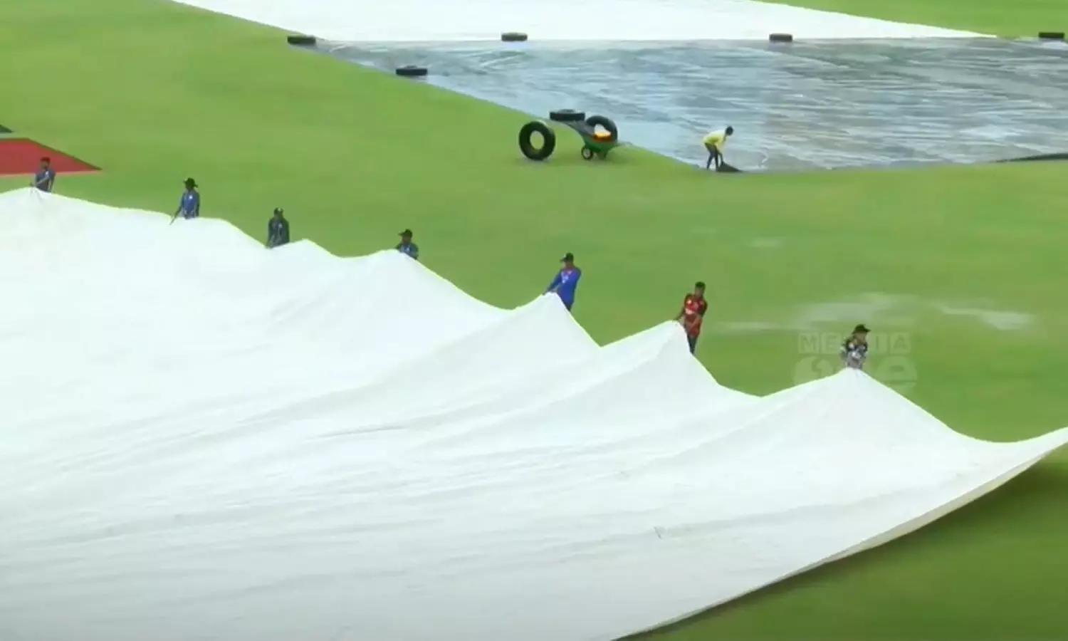 പിച്ചും ഔട്ട് ഫീൽഡും ഇപ്പോൾ മൂടിയിട്ടിരിക്കുകയാണ്. തുടർച്ചയായ മഴയിൽ ഗ്രൗണ്ടിൽ വെള്ളക്കെട്ട് രുപപെട്ടിട്ടുണ്ട്. ഇന്ന് തിരുവന്തപുരത്ത് ഓറഞ്ച് അലേർട്ട് പ്രഖ്യാപിച്ചിട്ടുണ്ട്. നാളെ മുതൽ മഴ കുറയുമെന്നാണ് കാലാവസ്ഥാ നിരീക്ഷണ കേന്ദ്രം അറിയിക്കുന്നത്.