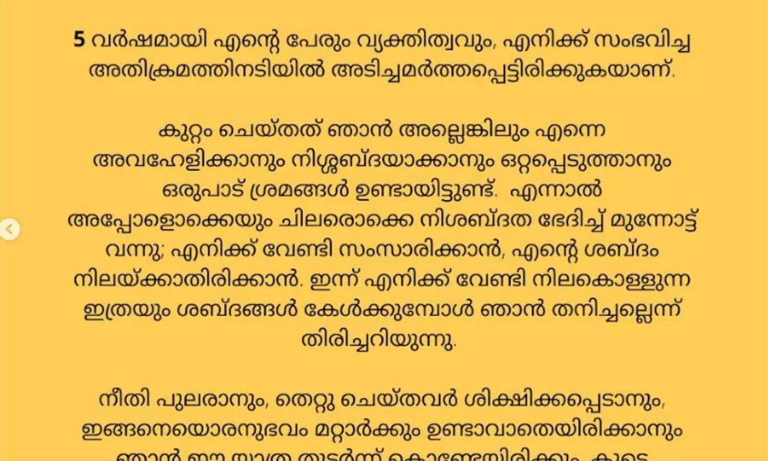 ഇരയാക്കപ്പെട്ടതിൽ നിന്നും അതിജീവനത്തിലേക്ക് ഉള്ള യാത്രയിലാണെന്ന് ആക്രമിക്കപ്പെട്ട നടി. ഈ യാത്ര ഒരിക്കലും എളുപ്പമായിരുന്നില്ല. അഞ്ചുവർഷമായി എന്റെ പേരും വ്യക്തിത്വവും എനിക്ക് സംഭവിച്ച അതിക്രമത്തിനിടയിൽ അടിച്ചമർത്തപ്പെട്ടിരിക്കുകയാണ്.