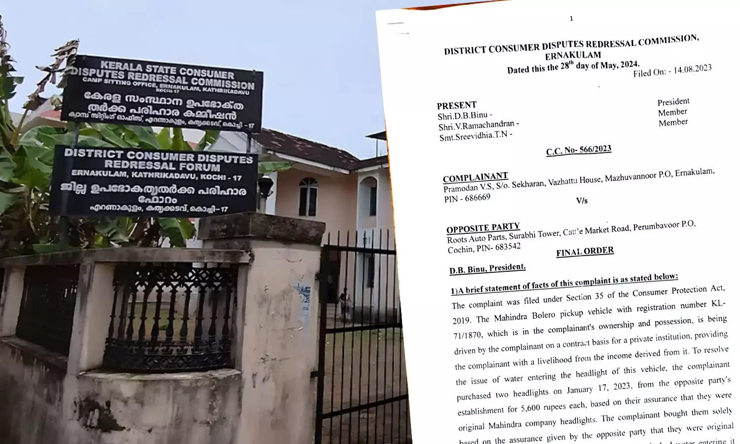 2023 ജനുവരിയിലാണ് രണ്ട് ഹെഡ്ലൈറ്റുകൾ എതിർകക്ഷിയിൽ നിന്നും പരാതിക്കാരൻ 5,600 രൂപയ്ക്ക് വാങ്ങിയത്. മഹേന്ദ്രയുടെ ഒറിജിനൽ ഹെഡ്ലൈറ്റുകൾ ആണെന്നാണ് എതിർകക്ഷി പരാതിക്കാരനോട് പറഞ്ഞത്. ഹെഡ്ലൈറ്റിൽ വെള്ളം കയറി ഉപയോഗശൂന്യമായ സാഹചര്യത്തിൽ അത് മാറ്റി നൽകാൻ പരാതിക്കാരൻ ആവശ്യപ്പെട്ടിട്ടും കടയുടമ തയാറായില്ല.
