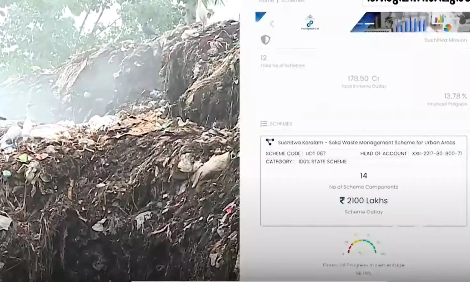 100 ശതമാനം സംസ്ഥാന പദ്ധതിയായ ശുചിത്വകേരളത്തിന് കീഴിലെ നഗരങ്ങളിലെ ഖരമാലിന്യ മാനേജ്മെന്റിനായി നീക്കി വെച്ച 21 കോടി രൂപയില് ചിലവഴിച്ചത് 14.76 ശതമാനം മാത്രമാണ്