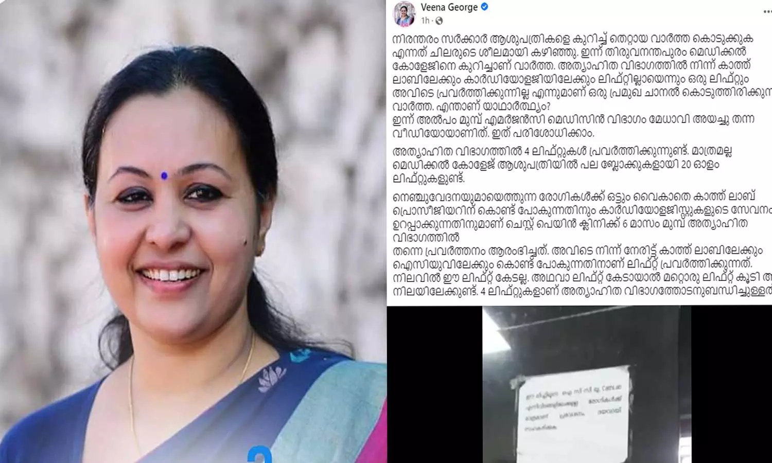 തിരുവനന്തപുരം: സർക്കാർ ആശുപത്രികളെ കുറിച്ച് ചിലർ തെറ്റായ വാർത്തകൾ നിരന്തരം പടച്ചുവിടുകയാണെന്ന് ആരോഗ്യ മന്ത്രി വീണാ ജോർജ്. ഫേസ്ബുക്ക് പോസ്റ്റിലൂടെയാണ് മന്ത്രിയുടെ വിമർശനം. തിരുവനന്തപുരം മെഡിക്കൽ കോളേജിനെ കുറിച്ചാണ് പുതിയ വാർത്ത. അത്യാഹിത വിഭാഗത്തിൽ നിന്ന് കാത്ത് ലാബിലേക്കും കാർഡിയോളജിയിലേക്കും ലിഫ്റ്റില്ലായെന്നും ഒരു ലിഫ്റ്റും അവിടെ പ്രവർത്തിക്കുന്നില്ലെന്നും വാർത്ത നൽകിയെന്നും മന്ത്രി കുറിച്ചു. കുറിപ്പിനൊപ്പം വീഡിയോ പങ്കുവെച്ചിട്ടുണ്ട്.