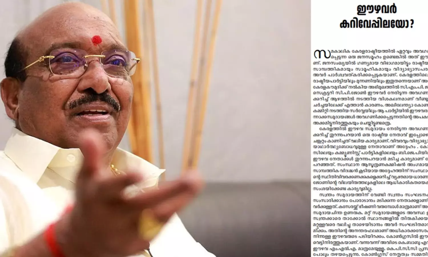 സ്വന്തം സമുദായത്തിനു വേണ്ടി സ്വന്തം സംഘടനകളിൽ സംസാരിക്കാനും പോരാടാനും മടിക്കുന്ന നേതാക്കളാണ് ഈഴവർക്കുള്ളത്. കസേരയ്ക്ക് ഭീഷണി വരുമ്പോൾ മാത്രമാണ് അവർക്ക് സമുദായചിന്ത ഉണരുക. മറ്റ് സമുദായങ്ങളുടെ അവസ്ഥ ഇതല്ല. സ്വന്തക്കാരെ താക്കോൽ സ്ഥാനങ്ങളിൽ തിരുകിക്കയറ്റാനും മറ്റുള്ളവരെ വലിച്ചു താഴെയിടാനും അവർ സംഘടിതമായി ശ്രമിക്കും. അതിന്റെ അനന്തരഫലമാണ് അധികാരക്കസേരകളിൽ നിന്നുള്ള ഈഴവരുടെ പടിയിറക്കം. കോൺഗ്രസിൽ ഈഴവരെ വെട്ടിനിരത്തുകയാണ്. വന്നുവന്ന് അവിടെ കെ. ബാബു എന്ന ഒരു ഈഴവ എം.എൽ.എ. മാത്രമേയുള്ളൂ. കെപിസിസി പ്രസിഡന്റ് പോലും തഴയപ്പെടുന്നു. കോൺഗ്രസ് നേതൃത്വം സമ്മതിച്ചില്ലെങ്കിലും അതൊരു യാഥാർത്ഥ്യമാണ്. ഒരുപക്ഷേ തെരഞ്ഞെടുപ്പ് കഴിയുമ്പോൾ ആ ഈഴവൻ പോലും പദവിയിൽ ഇല്ലാതാകും.