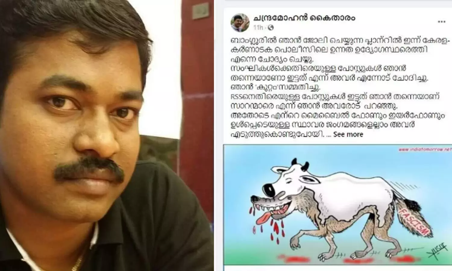 ആര്.എസ്.എസിനെ സോഷ്യല് മീഡിയയില് വിമര്ശിച്ചതിന് കേരള-കര്ണാടക പൊലീസ് തന്നെ ചോദ്യംചെയ്തെന്ന് മലയാളി യുവാവ്. ബംഗളൂരുവില് ജോലി ചെയ്യുന്ന ചന്ദ്രമോഹന് കൈതാരമാണ് ഫേസ് ബുക്ക് കുറിപ്പില് ഇക്കാര്യം പറഞ്ഞത്. മൊബൈല് ഫോണും ഇയര് ഫോണും പൊലീസ് കൊണ്ടുപോയെന്നും അദ്ദേഹം പറഞ്ഞു.